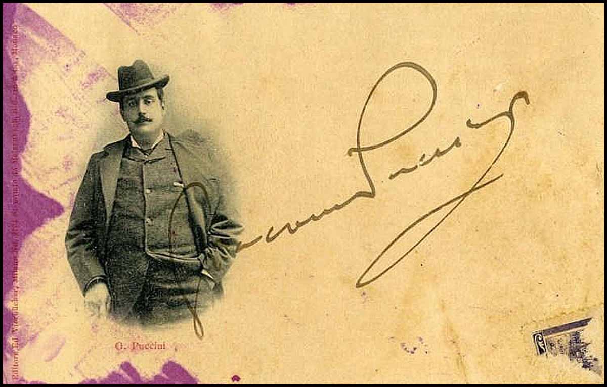 Oblong 14 x 9 cm portrait postcard photograph, boldly signed "Giacomo Puccini." With staining around the edges not affecting the signature or much of the image, mounting traces on the verso. From the collection of the Contessa Cais di Pierlas-Mocenigo.