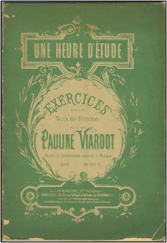 Viardot, Pauline. (1821-1910). Une Heure D'Etude. Excercices pour Voix de Femme. . Paris: Au Menestrel (Heugel & Fils). 1880. First edition. 8vo. 38 pp. [PN] PV 1. Original green wrappers, heavily chipped at spine, with 3 inch tear through cover. Else fine.