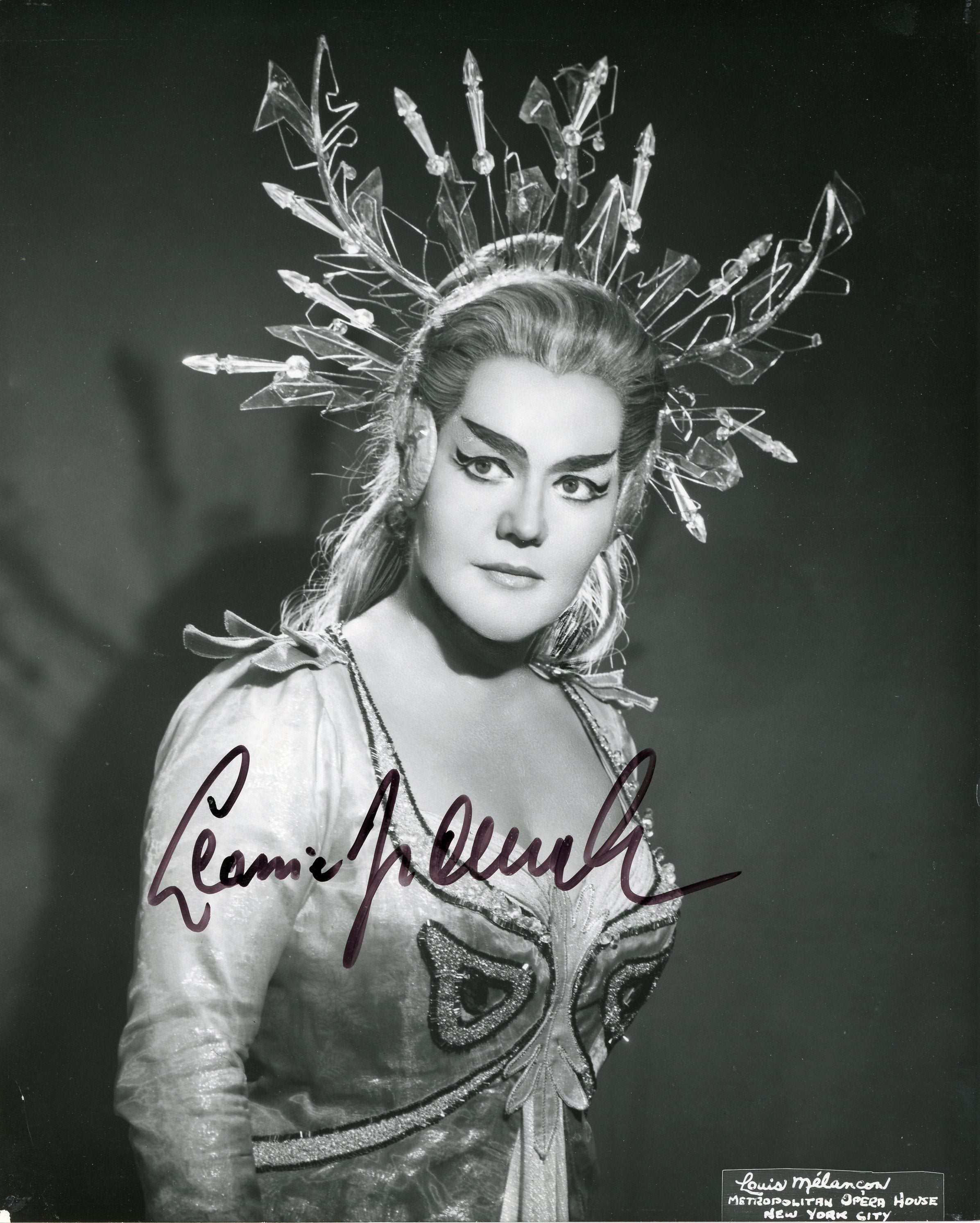 Vintage signed photograph of the great Austrian soprano known for her triumphs in Wagner and Strauss' dramatic works. Rysanek is shown in a dramatic costume and has signed boldly across the image. Photographed by Louis Mélançon for the Metropolitan Opera. Light wear to the edges; overall in fine condition. 8 x 10 inches (20.4 x 25.3 cm).