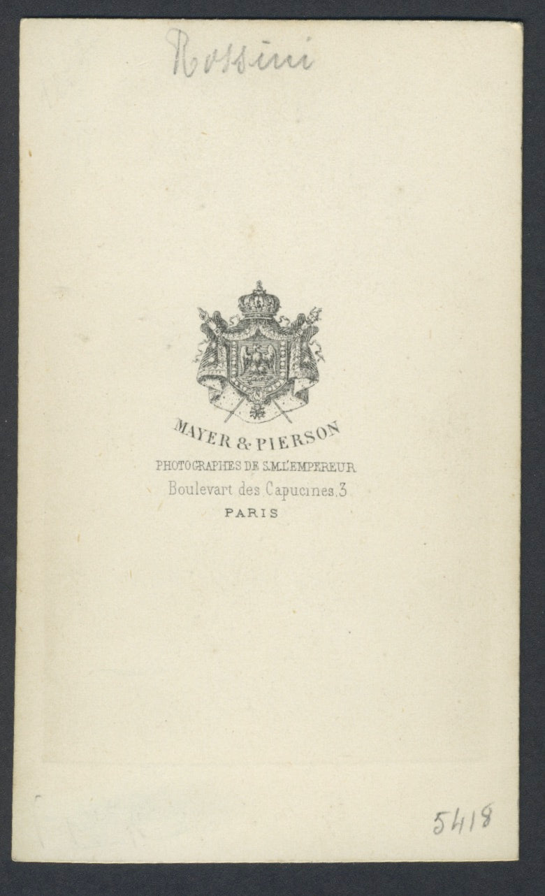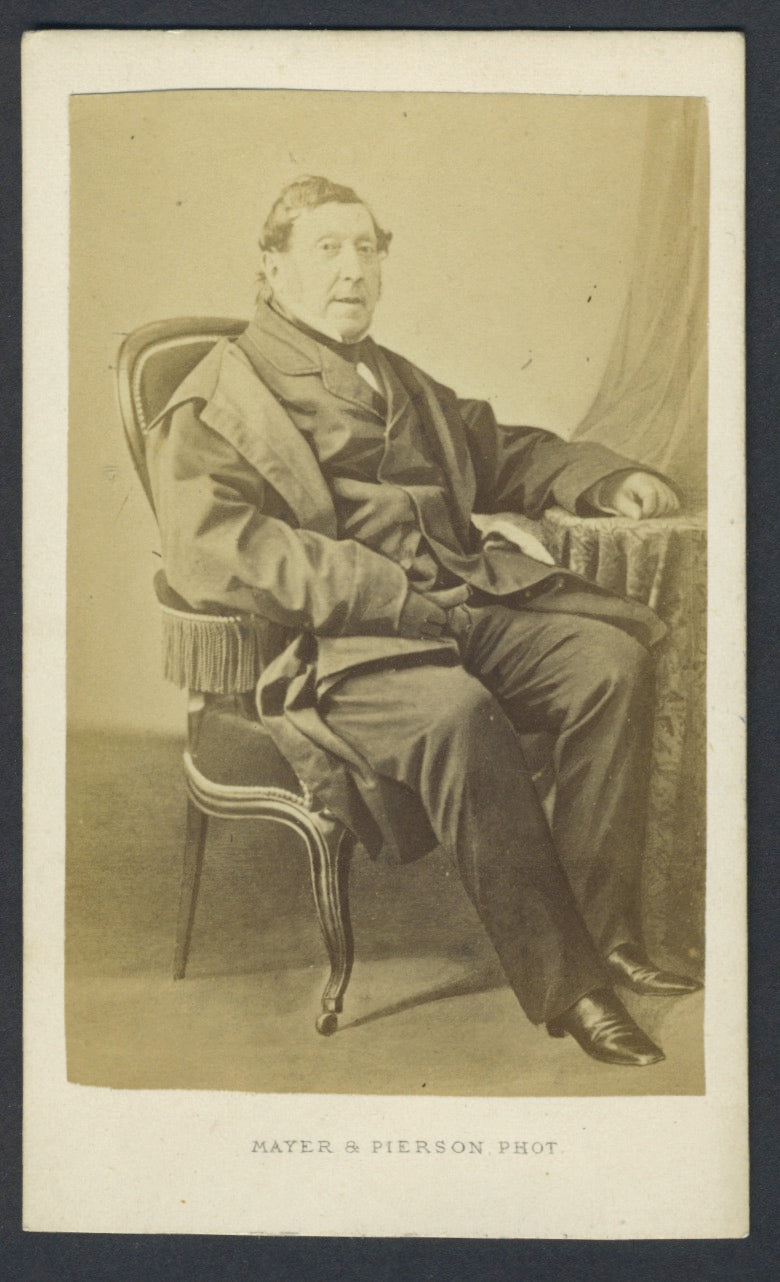 Carte de visite photograph of the important opera composer, photographed by Mayer & Pierson of Paris. Rossini is shown seated in an armchair, with his left hand resting on a table. Fine. 2.5 x 4 inches (6.1 x 10.2 cm).