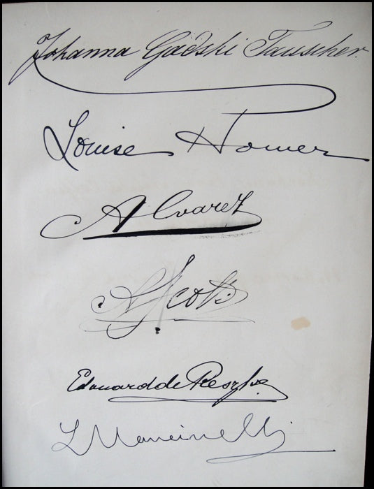 [Verdi, Giuseppe. (1813–1901)] Homer, Gadski, Scotti, Alvarez, Reszke, Mancinelli. Aida Score, Signed by Metropolitan Opera Golden Age Stars. New York: G. Schirmer. 1897. A nice copy of Aida in gilt-stamped burgundy cloth. Boldly signed on the first free endpage by Metropolitan Opera conductor/composer, Luigi Mancinelli (1848-1921) and by five of the great Golden Age stars of the Met: Louise Homer, American contralto (1871-1947); Johanna Gadski, soprano (1872-1932); Albert Alvarez, French tenor (1861-1933); Antonio Scotti, Italian baritone (1866-1936); Edouard de Reszke, Polish bass (1853-1917).