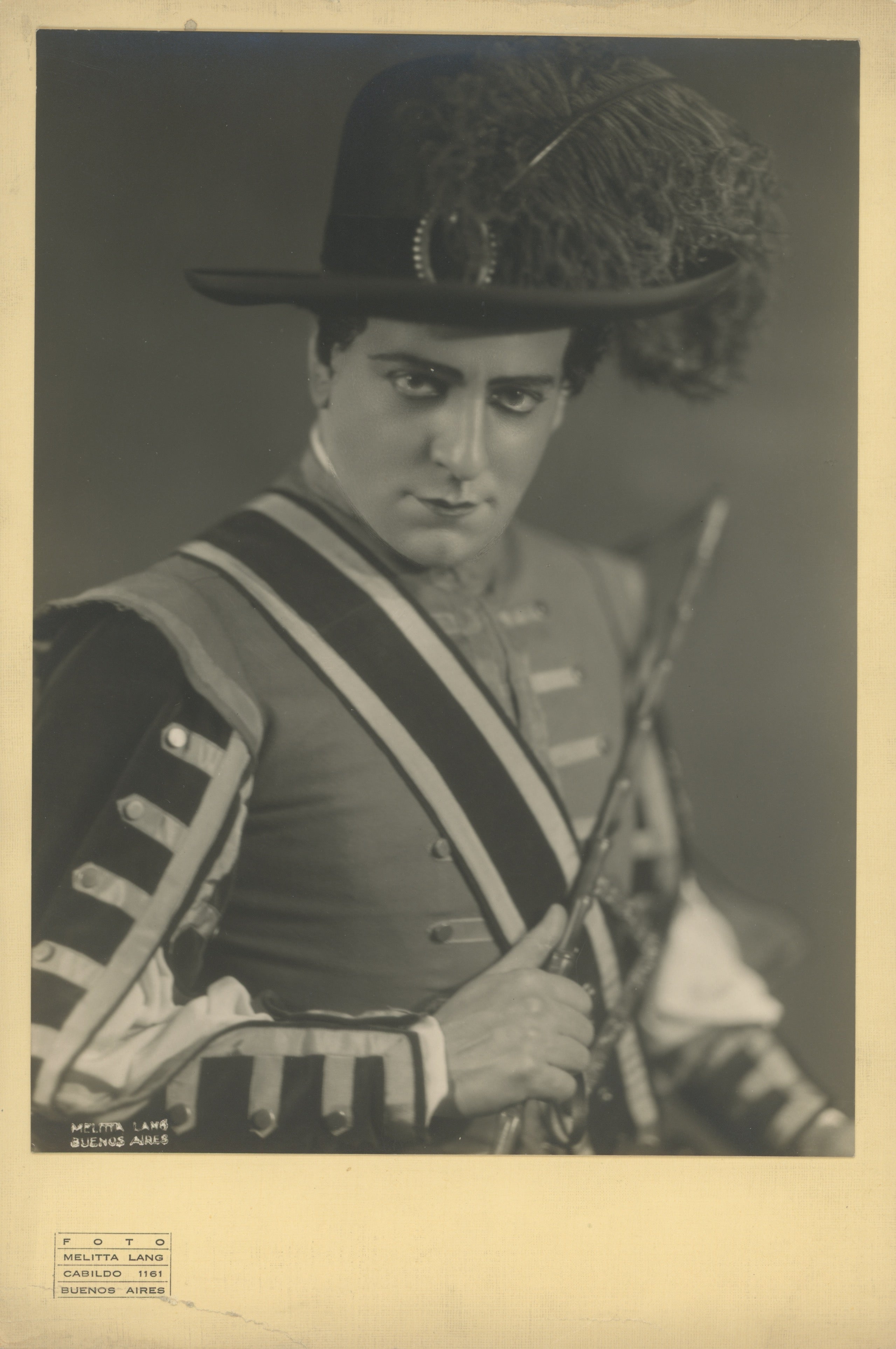 Schipa, Tito. (1888–1965). Original Photograph in "The Barber of Seville. Striking original doubleweight Melitta Lang of Buenos Aires photograph of the great Italian tenor in costume as Count Almaviva for a production of Gioachino Rossini's The Barber of Seville. Two small tears to lower margin of photographer's mount, image in very fine condition. On the original photographer's linen-textured mount, pencil note on verso from Chicago Civic Opera. 7 x 10.75 inches (17.8 x 27.3 cm.).