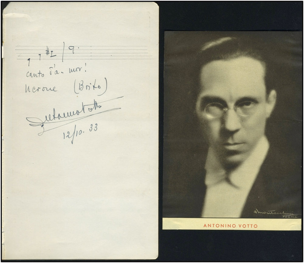 Votto, Antonino. (1896-1985). Autograph Musical Quotation from Boito's "Nerone." . A scarce early AMQS from the important Italian conductor. On an album page, 11.5 X 18.5 cm, sold together with a nice vintage halftone photograph.