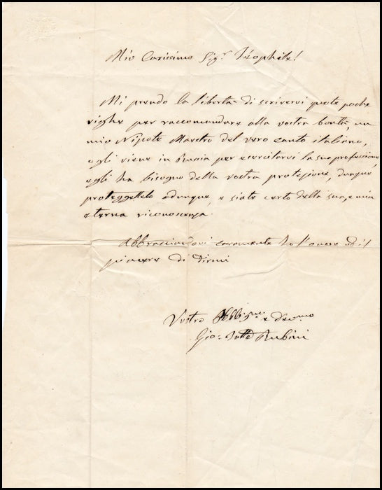 Addressed "Mio Carissimo Sigr. Théophile!" Translated in full: "I take the liberty to write to you a few lines to recommend to your care, my nephew, a Maestro of true Italian singing, who arrives in Russia to exercise his profession, and who requires your protection/sponsorship, and for your protection you will be assured of his, and my own, eternal gratitude. Embracing you warmly, I have the honor and pleasure of calling myself, your most obliged and -- Gio. Batt. Rubini."