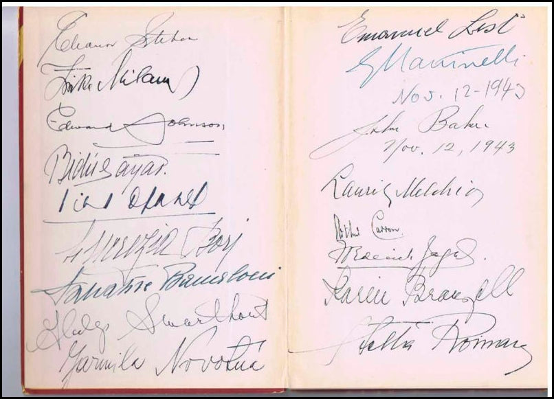 Remarkable book giving fascinating photos and insights into the great opera stars at the Metropolitan Opera in New York during the War years. An incredible group of stars have signed the front endpapers: Eleanor Steber, Zinka Milanov, Edward Johnson, Bidu Sayao, Lili Djanel, Lucrezia Bori, Salvatore Baccaloni, Gladys Swarthout, Jarmila Novotna, Emanuel List, Giovanni Martinelli, John Bker, Lauritz Melchior, Arthur Carron, Frederick Jagel, Karin Branzell and Stella Roman! Spine cover perished, but holding strong and otherwise fine.