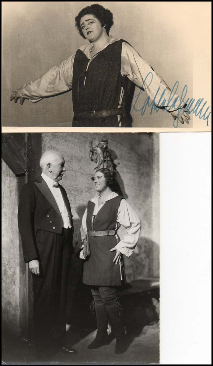 Boldly signed postcard photograph of the great soprano in perhaps her greatest role, as Leonore in Beethoven's "Fidelio." This photograph is from the 1927 Beethoven Centenary production conducted by Richard Strauss and is sold together with a vintage Ellinger photograph of Lehmann and Strauss together during the preparation of this production. Both very fine.