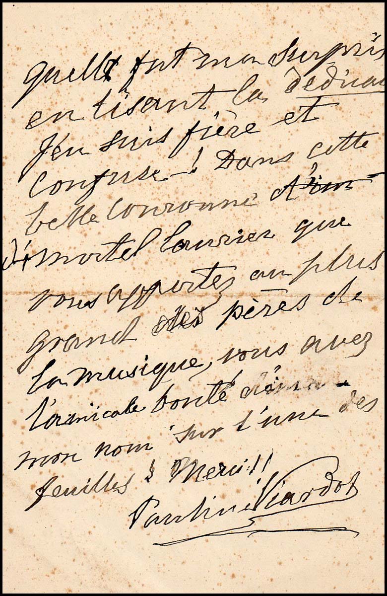 Viardot, Pauline. (1821 - 1910) [Tiersot, Julien. (1857-1936)]. Autograph letter signed to the French musicologist and folklorist [Julien] Tiersot.. 2 pages. Octavo. Dated December 2, 1909. In French (with translation). A remarkable letter, written in a slightly shaky hand just 5 -1/2 months before Viardot's death at the age of 89, in which it is apparent that she was still very actively involved in music. Viardot apologizes to Tiersot for not being able to see him: "A long audition of students that I could not interrupt deprived me recently of the pleasure of receiving you," and goes on to comment on his "lovely book on Gluck" which she just saw the day before, thanking Tiersot for dedicating it to her: "The great man was hidden among other books, but he had chosen such a good spot, next to Berlioz!!! Such was my surprise in reading the dedication, I am proud of it and overwhelmed!" Creased at central fold, small foxing spots, some smudging and corrections, generally fine.