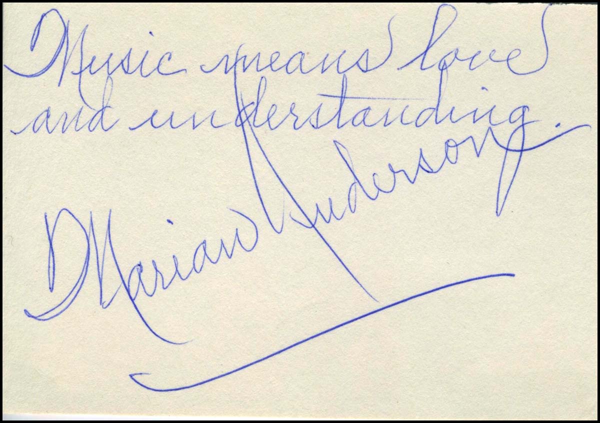 Anderson, Marian. (1897–1993). "Music means love and understanding" - Autograph Quotation. Beautifully penned autograph signed quotation from the great African American contralto who writes "Music means love and understanding" and signs "Marian Anderson" on a card measuring 12.5 x 9 cm. Fine.
