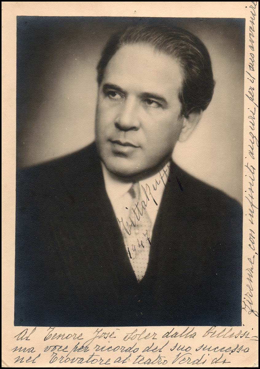 Ruffo, Titta. (1877 - 1953). Signed Photograph to José Soler. Interesting signed photograph from Golden Age Italian baritone, addressed to the great heroic tenor José Soler (1904 - 1999) signed and dated 1947, effusively inscribed: "Al Tenore José Soler della bellissima voce per ricordo del suo successo nel Trovatore al teatro Verdi di Firenze, con infiniti auguri per il suo avvenire." Small pinhole in upper margin, lower corners a little bent, otherwise very good condition. 16.5 x 23.5 cm. A marvelous association.