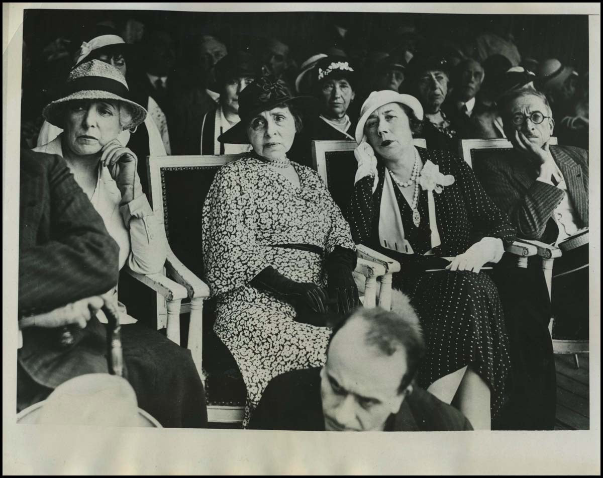 Interesting vintage 10 x 8 inch press photograph of the composer's widow together with Marguerite Long and others at the dedication of a statue in Debussy's honor at St. Germain near Paris, July 8, 1933.