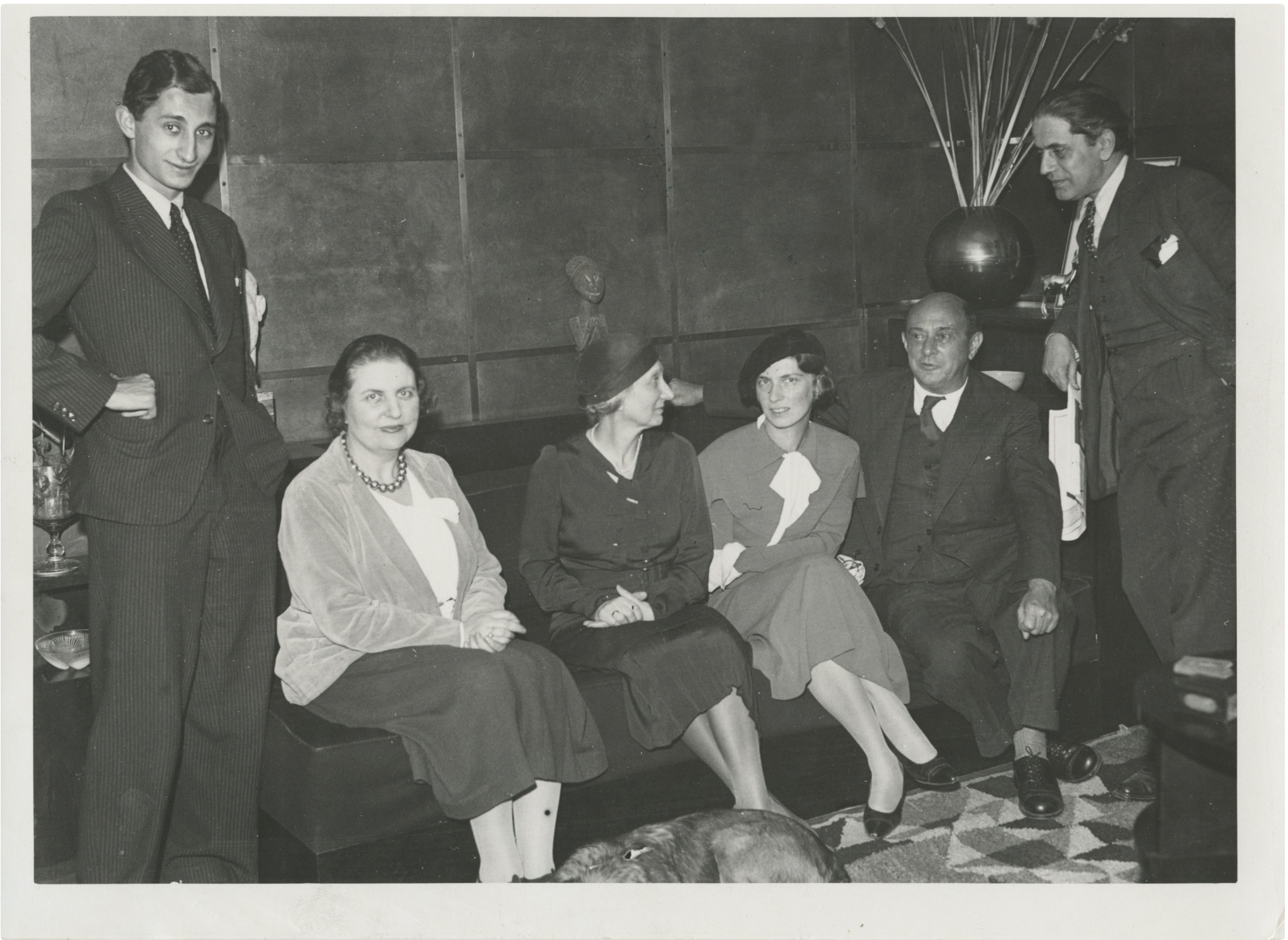 Schoenberg, Arnold. (1874-1951). Original 1933 Photograph "On the Eve of His Departure for the United States". Original photograph of the influential composer, shown at the home of Mr. and Mrs. Eric Allatini in Paris on the eve of his departure to the United States to take up his teaching position at the Malkin Conservatory in Boston. He is seen here, left to right, with: Rudi Goehr, Schoenberg's youngest pupil; Mrs. Allatini, founder of the Foyer Henri Heine for Jewish Intellectuals Relief in Paris; Frau Kolisch, Mother of Frau Schoenberg; Frau Schoenberg; the composer and Monsieur Allatini. In fine condition. Stamped Oct 31, 1933 on the verso. 9.5 x 7.25 inch (17.25 x 23.5 cm).