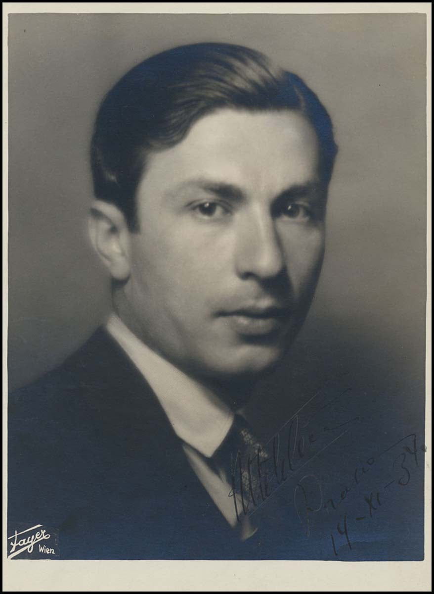 Superb image of the supreme Russian violinist, noted for his fine interpretations of the unaccompanied Bach sonatas and Romantic works. He performed well into his mid-80s, won a 1975 Grammy, a Legion of Honor medal from France and a Kennedy Center Honor. One of the GREATS, considered by many to be in a class with Heifetz. A wonderful early head and shoulders portrait by Fayer, signed "Praha, 14-XI-34". 17 x 23 cm.