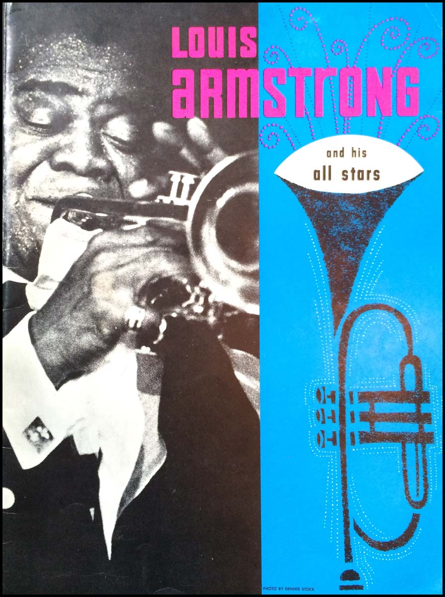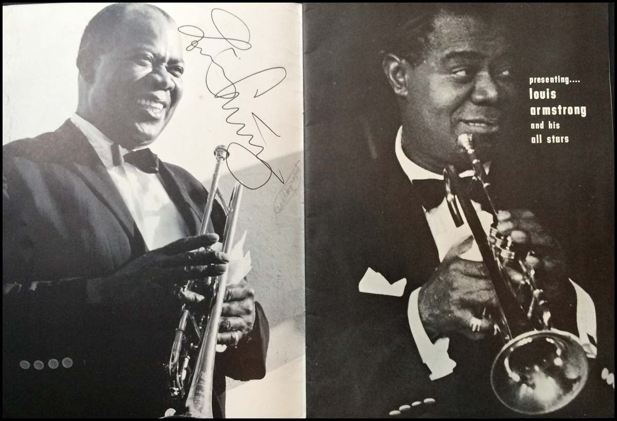 Vintage 9 x 12 inch inch photograph of the great Satchmo, trumpet in hand, boldly signed "Louis Armstrong." Inside a complete program "Louis Armstrong and His All Stars", ca. 1960. 12 pp plus illustrated covers. The program also includes the signatures of Danny Barcelona and Russel Moore.