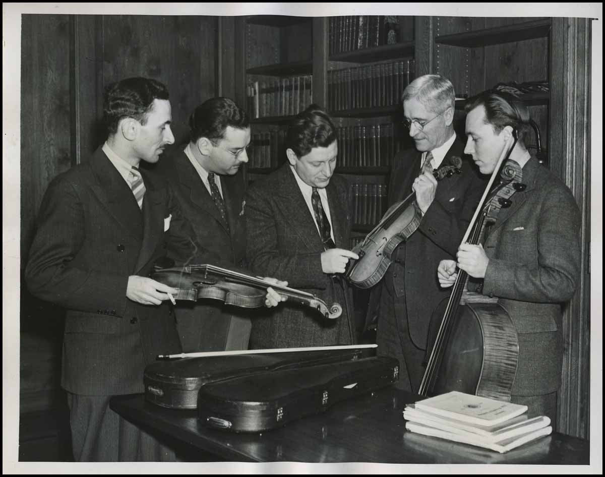 An amusing photograph of the great string quartet (Jascha Brodsky, Charles Jaffe, Max Aronoff, Orlando Cole) with one Dr. Saunders of Harvard as they "discuss the merits of the modern violin as contrasted to the famed Stradivarius." News snipe on verso, stamped 03-22-1940, a little rippled, else fine. 9 x 7.25 inches.