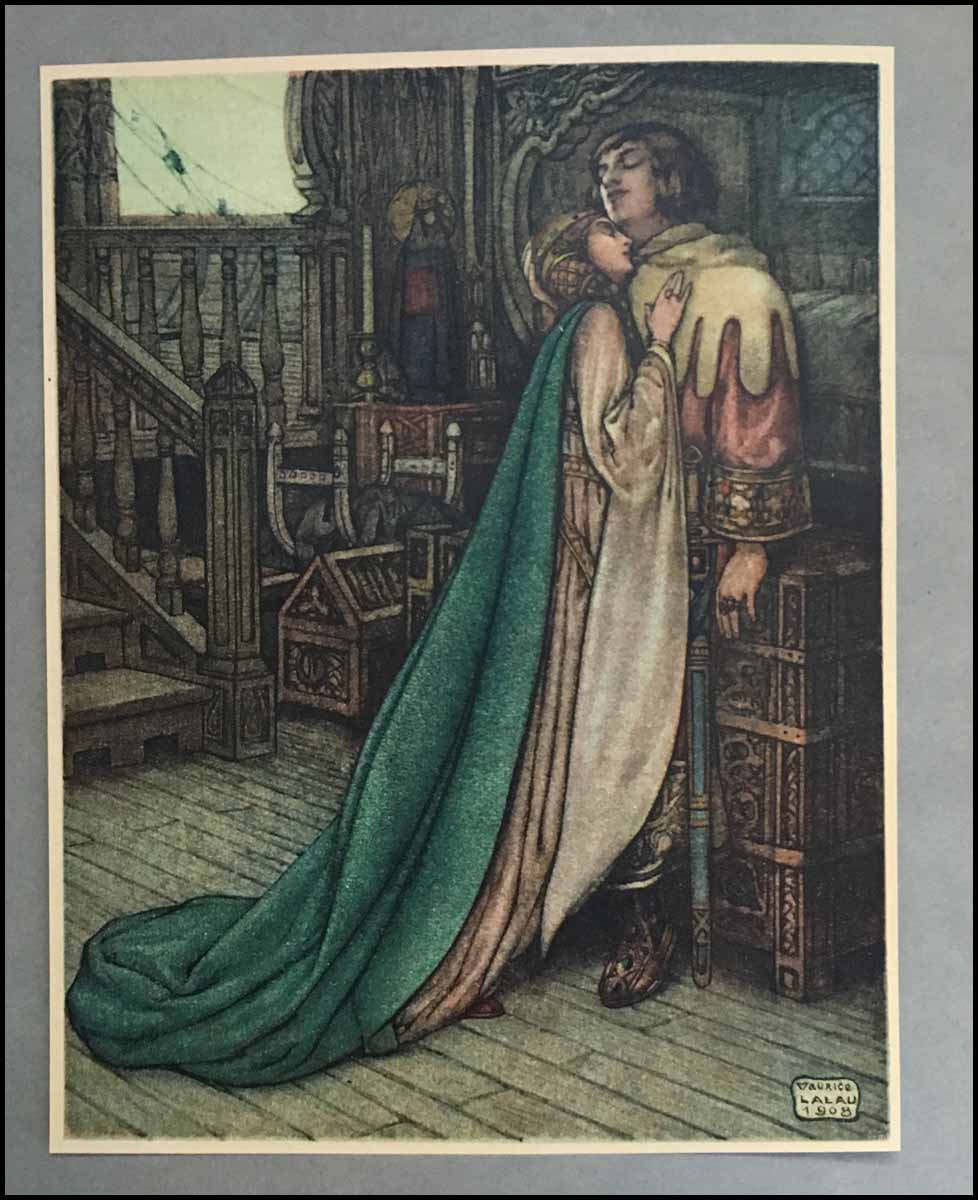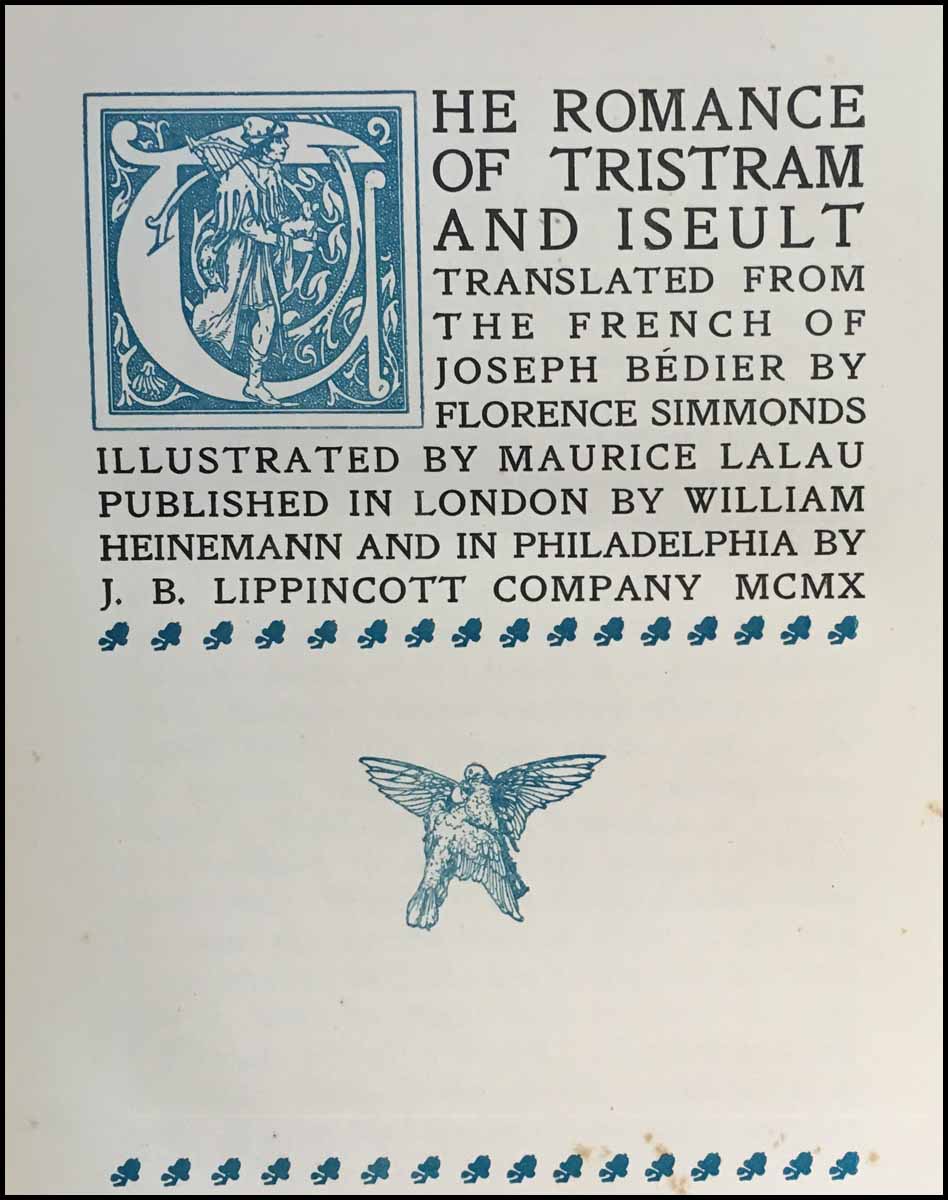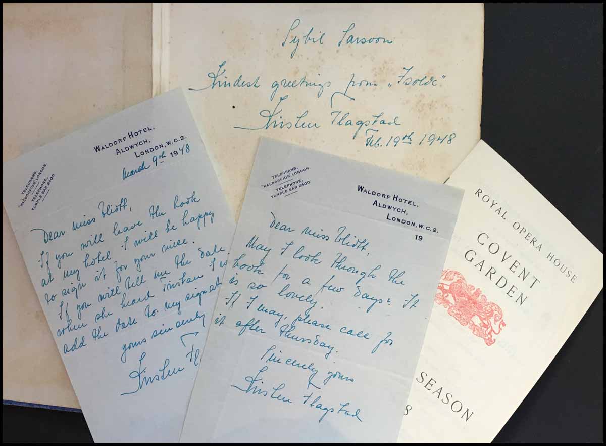 [Opera] Flagstad, Kirsten. (1895–1962) [Bedeir, Joseph.; Simmonds, Florence. (trans.)]. The Romance of Tristran and Iseult - INSCRIBED BY FLAGSTAD & WITH 2 AUTOGRAPH LETTERS TO SYBIL SASSOON. London: William Heinemann. 1910. 4to, 218 pp., 20 mounted colour plates by Maurice Lalau, decorated initials to each chapter, fore-edge uncut, blue cloth decorated in white and gilt. Scattered foxing, some abrasion of the cloth, spine faded, slight tears at head. A most wonderful signed copy from the supreme Norwegian soprano so closely associated with the role of Isolde, inscribed on the front endpaper "Sybil Sassoon - Kindest greetings from "Isolde", Kirsten Flagstad, Feb 19th 1948." Together with two brief letters from Flagstad to Sybil Sassoon who had seen the performance at Covent Garden, saying that she will sign the book if it can be left at her hotel, and then requesting that she may be able to look through the book for a few days "as it is so lovely." And with the complete Covent Garden program.