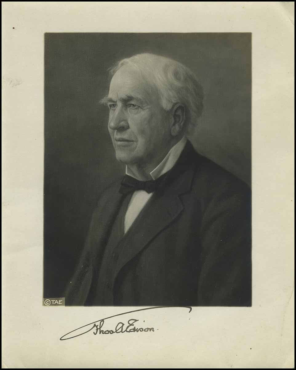 [History & Culture] Edison, Thomas. (1847–1931). Signed Photograph. Vintage matte-finish 8 x 10 photo of an artist’s portrait of Edison, signed in the lower border in fountain pen “Thos. A. Edison.” In fine condition, with a bit of light border soiling around the edges and a creases to the border edges and corners. A particularly nice uninscribed example.