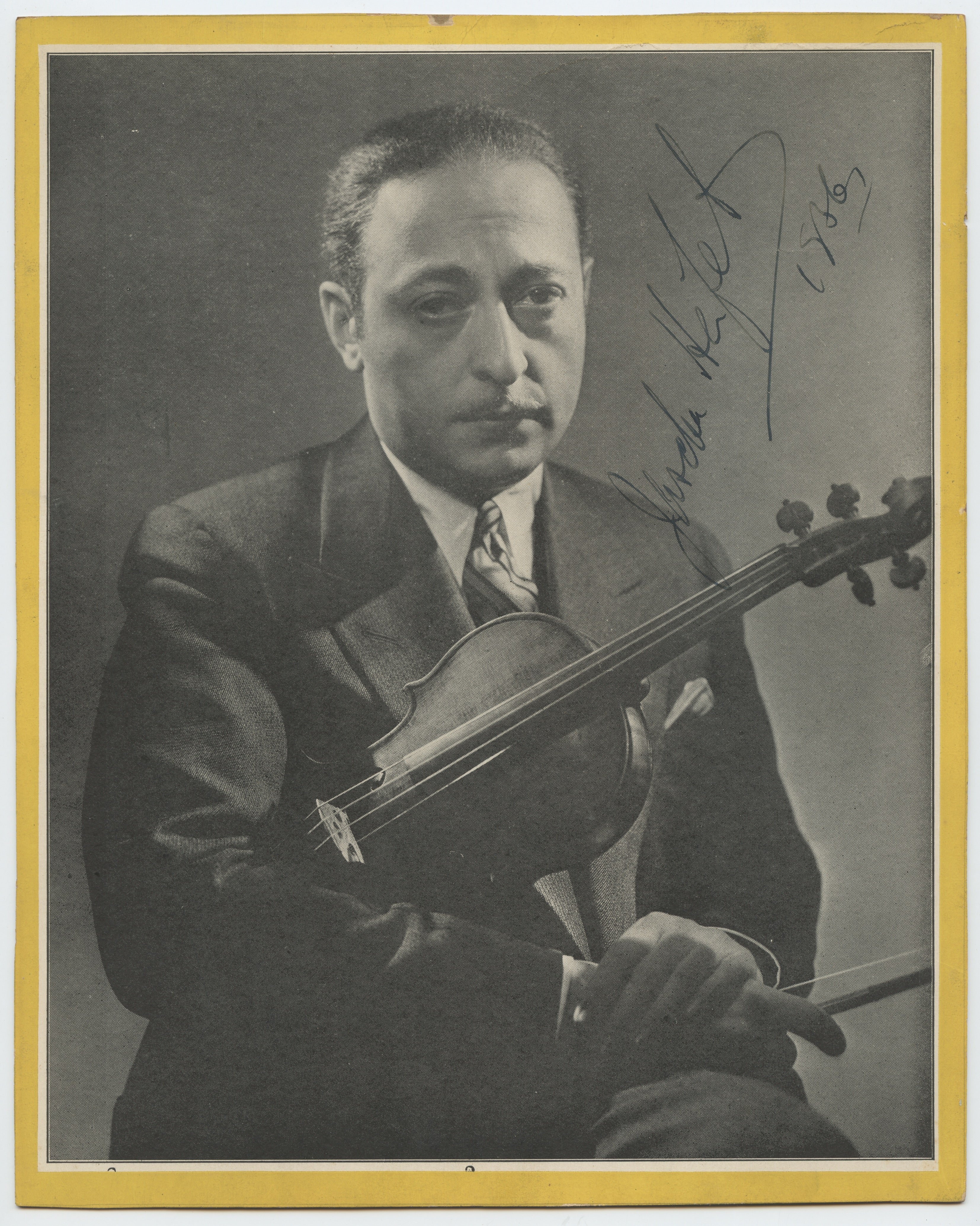 8 x 10 inch halftone photograph of the supreme violinist holding his violin and bow, boldly signed with his name alone and dated 1936. Laid down to a rigid yellow paper backing, otherwise fine.