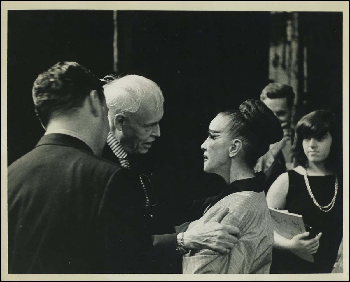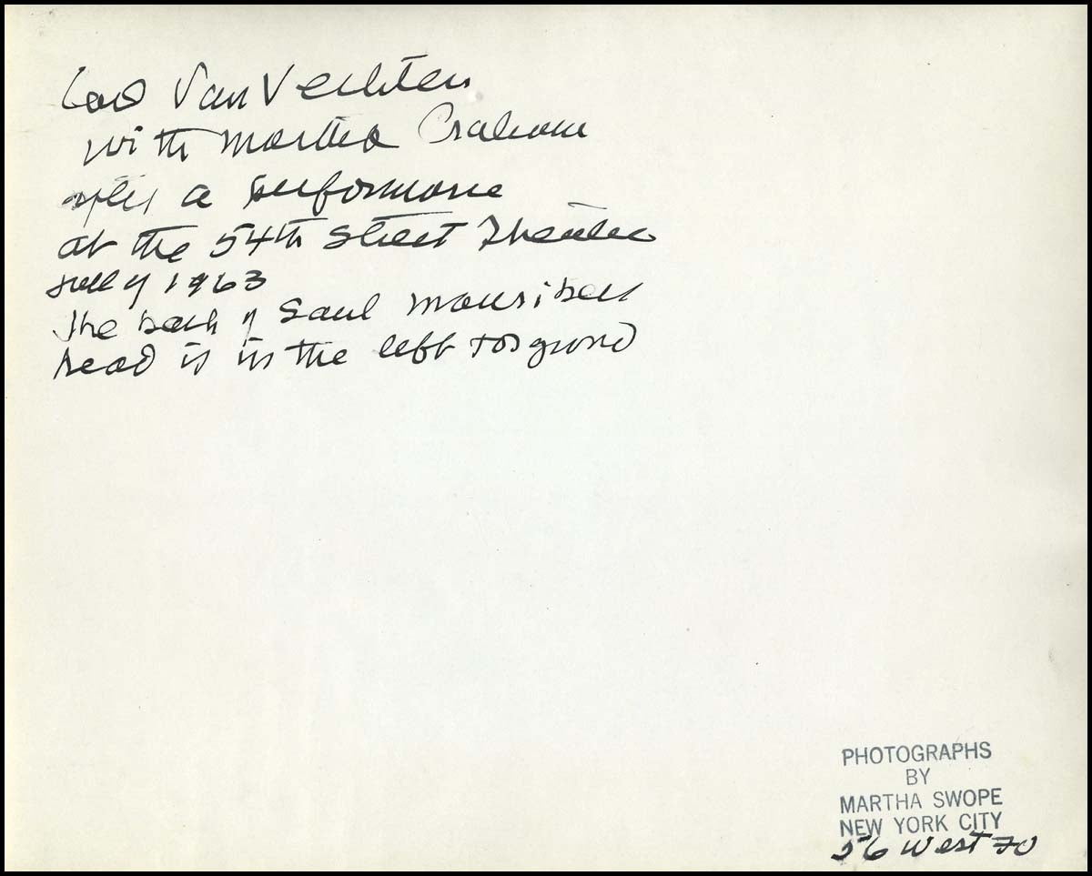 Verso bears original 'Photographs by Martha Swope / New York City' credit stamping and the following ID notation in her hand: 'Carl Van Vechen with Martha Graham after a performance at the 54th Street Theatre / July 1963 / The back of Saul Mauriber's head is in the left foreground." In fine condition.