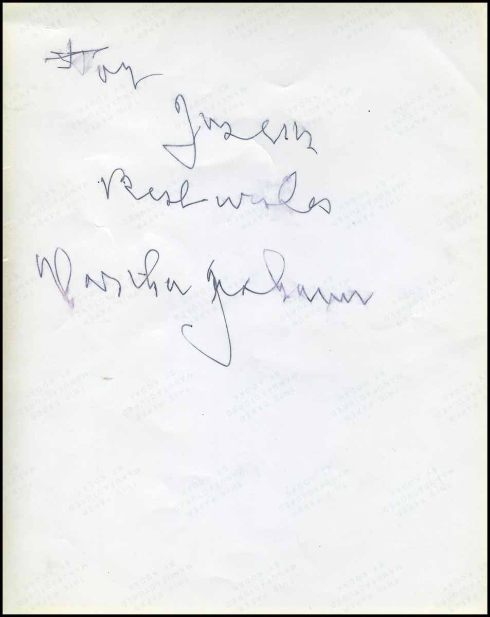 Unusual vintage 8 x 10 inch color photograph of the great dancer and choreographer shaking the hand of Pope John Paul II, inscribed and signed in black ink on the verso “For J--- / Best wishes / Martha Graham.” A few minor creases, else fine and a most unusual image!