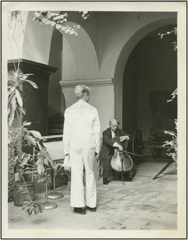 A very unusual photograph of the great cellist, serenading a Navy cadet in an unidentified setting. 8 X 10 inches.