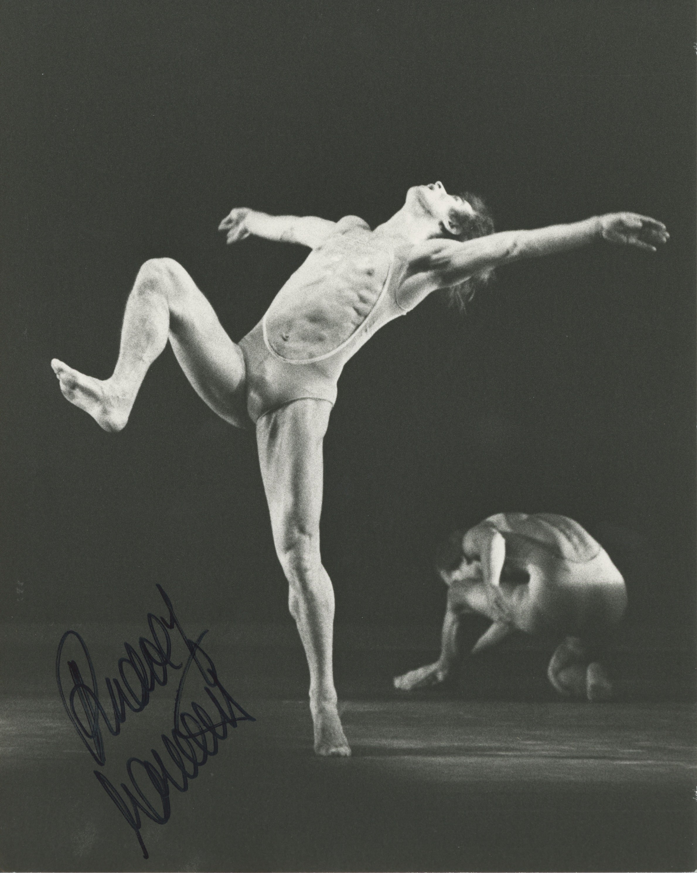 Nureyev, Rudolf. (1938–1993). Signed Photograph in "Moments". Striking original photograph of the great dancer in Murray Louis' "Moments" in 1975, boldly signed at the left. Photographed by Beverley Gallegos. In very fine condition. 8 x 10 inches (20.3 x 25.3 cm).