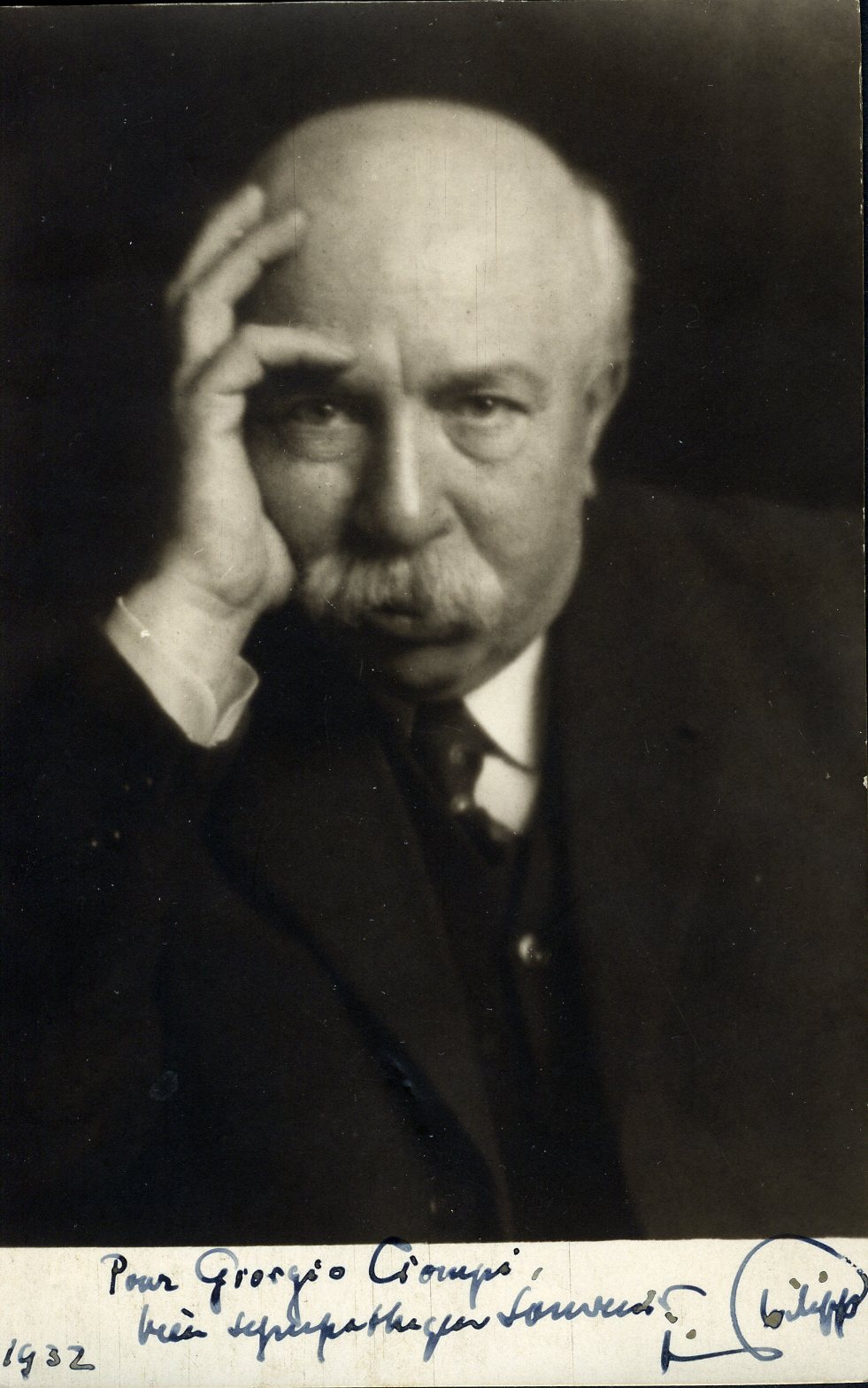 Philipp, Isidor. (1863 - 1958). Signed Photograph. Signed postcard photograph of the renowned French pianist, composer and pedagogue of Hungarian birth, inscribed at the foot in French to Giorgio Ciompi and dated 1932. Mounting remnants on the verso and some light edge wear; overall in fine condition. 3.5 x 5.5 inches (8.4 x 13.7 cm).