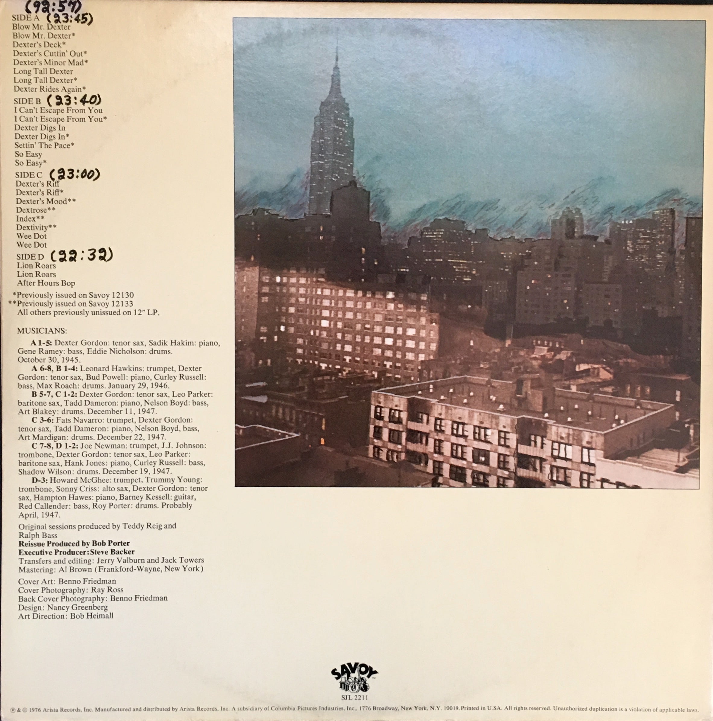 The tenor saxophonist Dexter Gordon was among the earliest tenor players to adapt the bebop musical language of innovators such as Charlie Parker, Dizzy Gillespie, and Bud Powell to his instrument. Known as "Long Tall Dexter" for his height of 6 foot 6 inches, he was also beloved by audiences for his genial stage presence and ability to communicate with his listeners. Gordon's bebop career began in 1940's New York, where he appeared with the Billy Eckstine big band and recorded with Dizzy Gillespie and Sir Charles Thompson, among others. After struggling with heroin and serving jail time in the 1950's, he had renewed success with his album The Resurgence of Dexter Gordon in 1960, signing with Blue Note Records in 1961. He spent much of the 1960's and 1970's in Europe, which he found more welcoming to jazz musicians than the U.S., before returning in 1976. Long Tall Dexter, a compilation of previously released and unreleased tracks from his early Savoy recordings in the 1940's, was released in 1976.