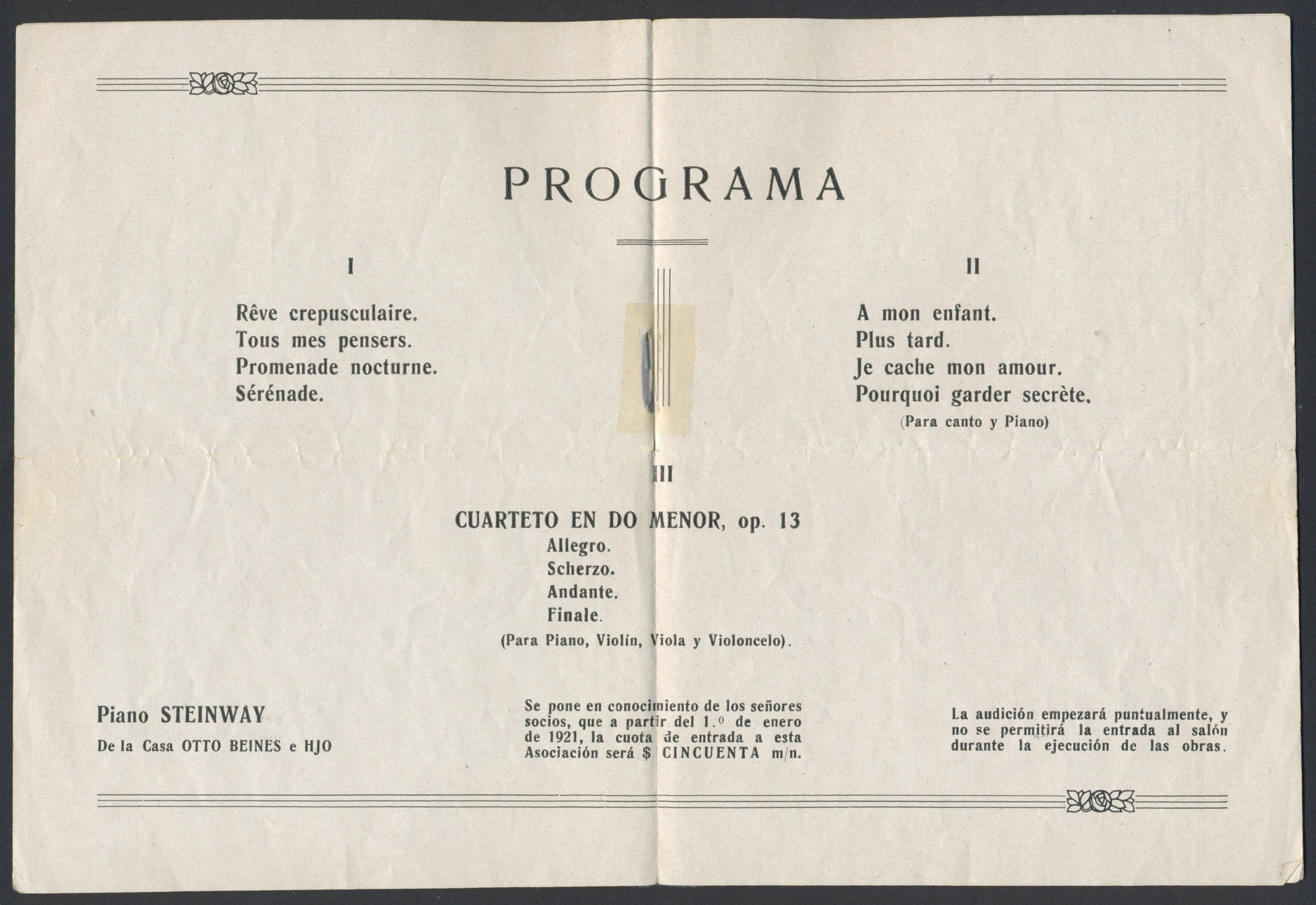 Original program from a 1920 Buenos Aires concert given by the important composer, boldly signed by Strauss on the inside front cover below his photograph. The concert, given by the Asociacion Wagneriana de Buenos Aires on November 12, 1920, featured Strauss at the piano, with French soprano Ninon Vallin and string players Astor Bolognini, Edgardo Gambuzzi and Adolfo Morpurgo. The program included works for piano, songs, and the Quartet in C minor, op. 13. 6 pp. 5 x 6.75 inches (12 x 17 cm). Horizontal folding crease; two tape repairs to the spine; overall in very good condition and a fine signature.