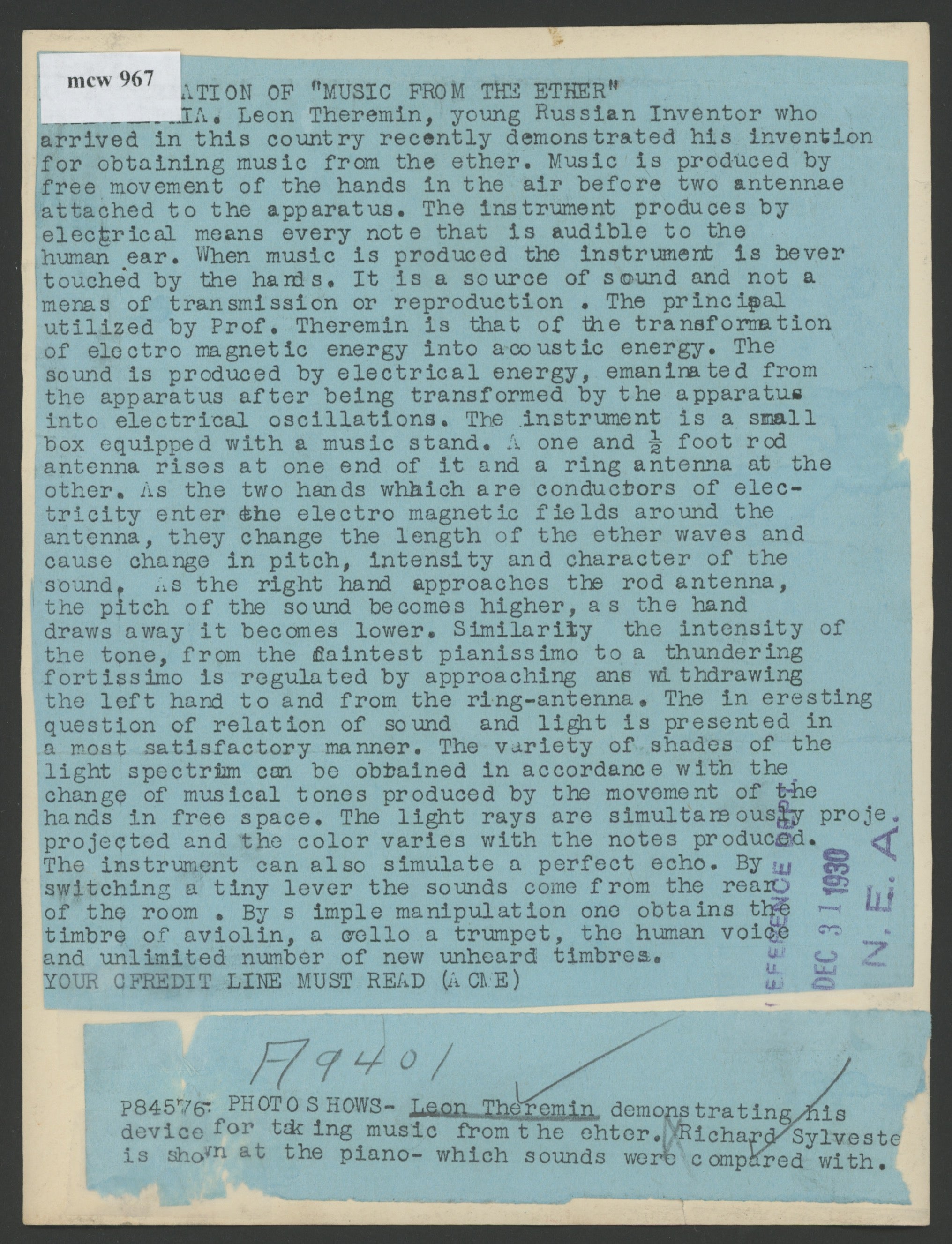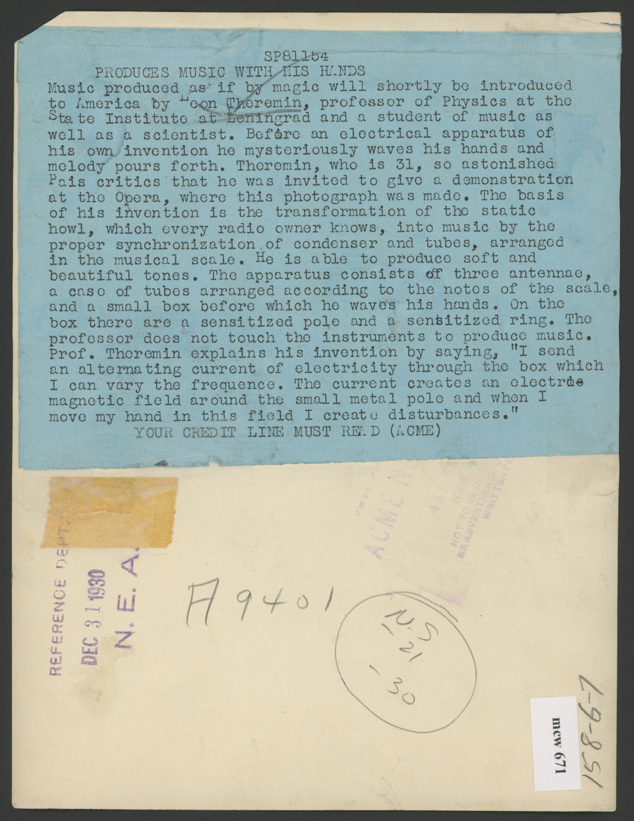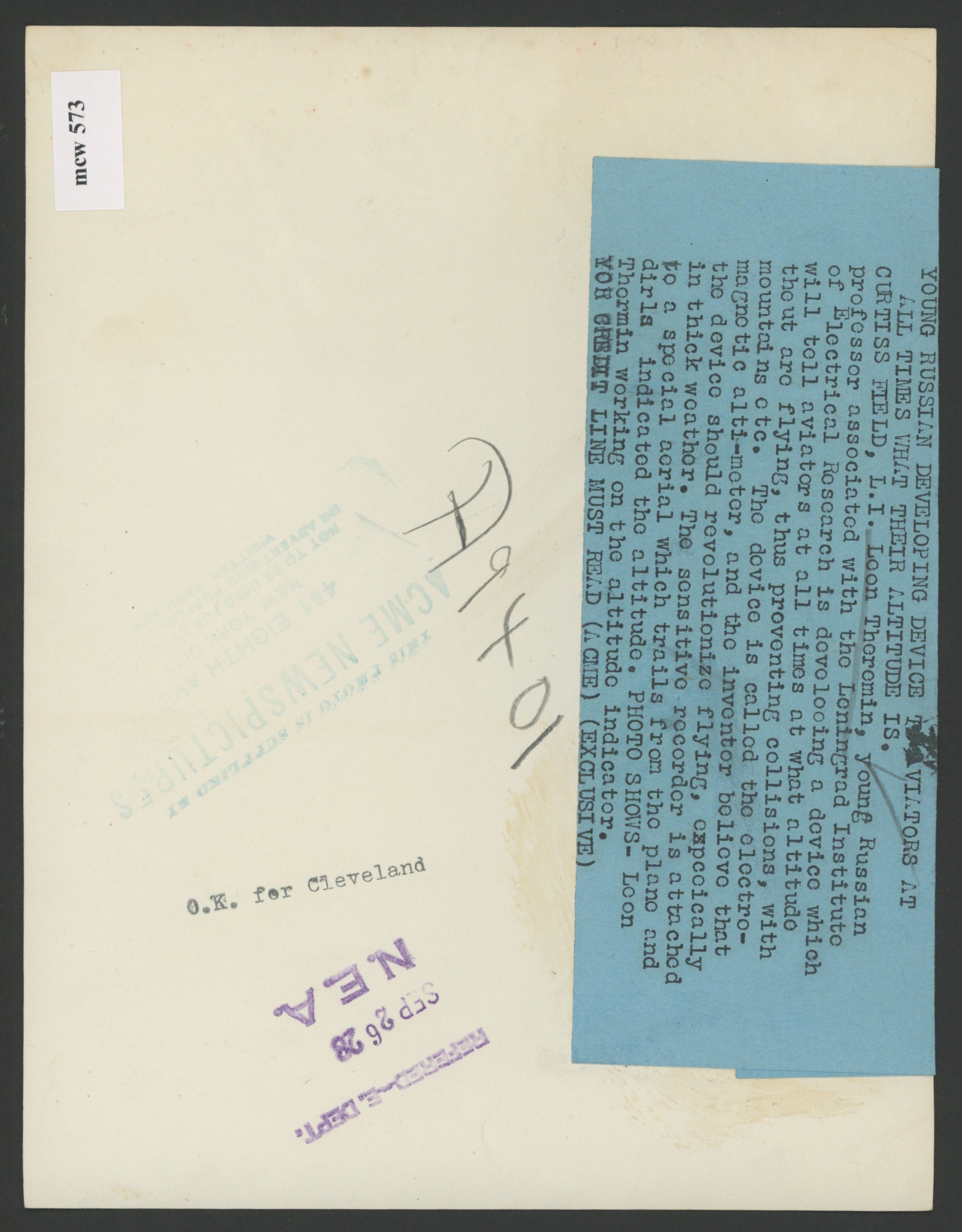 Three interesting original press photographs of the Russian scientist most famous for his invention of the theremin, one of the first electronic musical instruments. Two of the photographs, stamped 1930 on the verso, show him demonstrating the theremin around the time of its introduction to U.S. audiences; the third picture, stamped 1928, shows him using another device, for altitude measurement. Each 6.5 x 8.5 inches, with original press captions on the verso.
