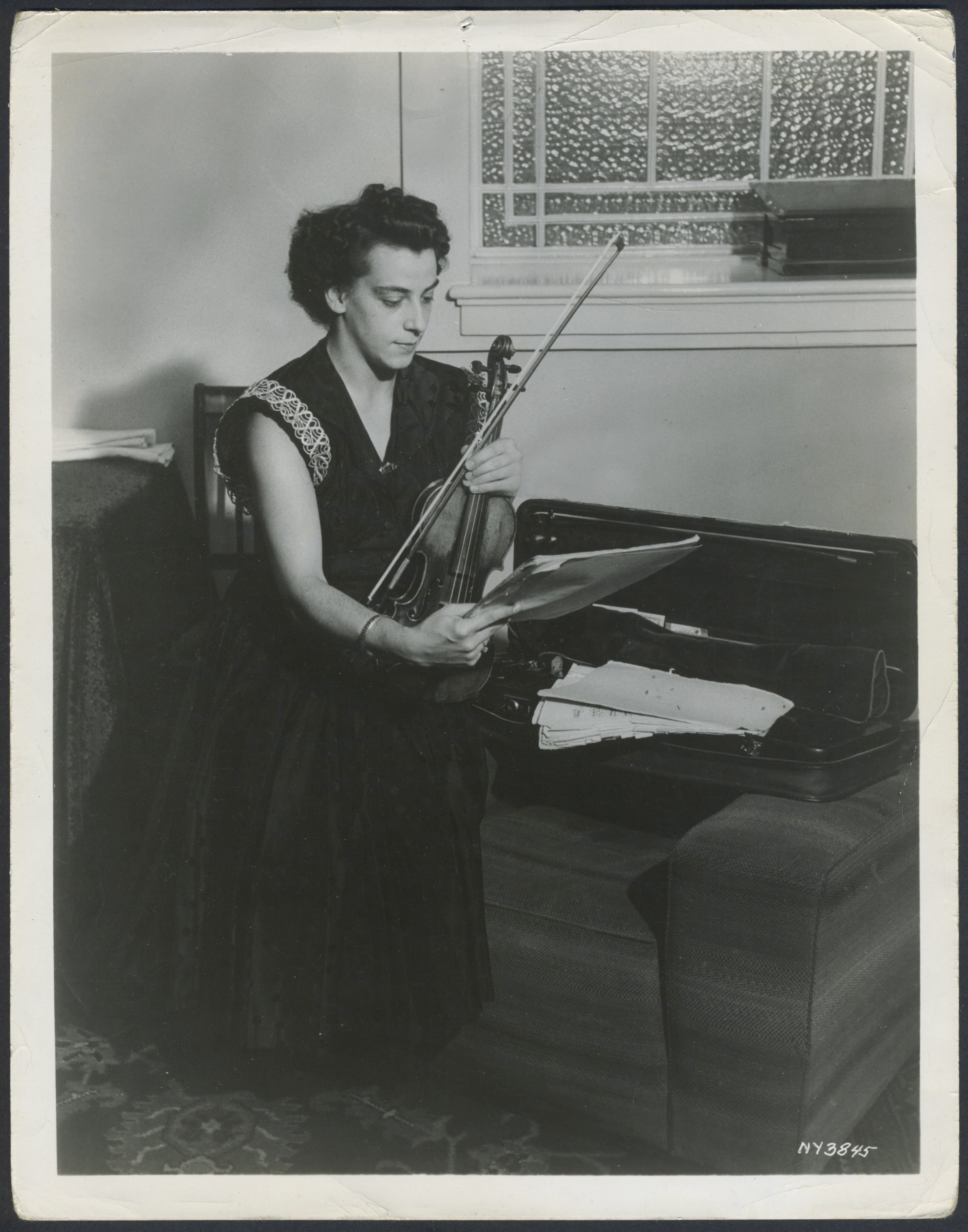Neveu, Ginette. (1919–1949). Original Photograph. Uncommon original photograph of the brilliant French violinist, a prodigy who died tragically young. She is shown preparing for a concert, holding music and her instrument as she sits next to her open violin case. Some light edge and corner creases, with one small hole to the upper margin; otherwise in fine condition. 8 x 10 inches (20.3 x 25.9 cm).
