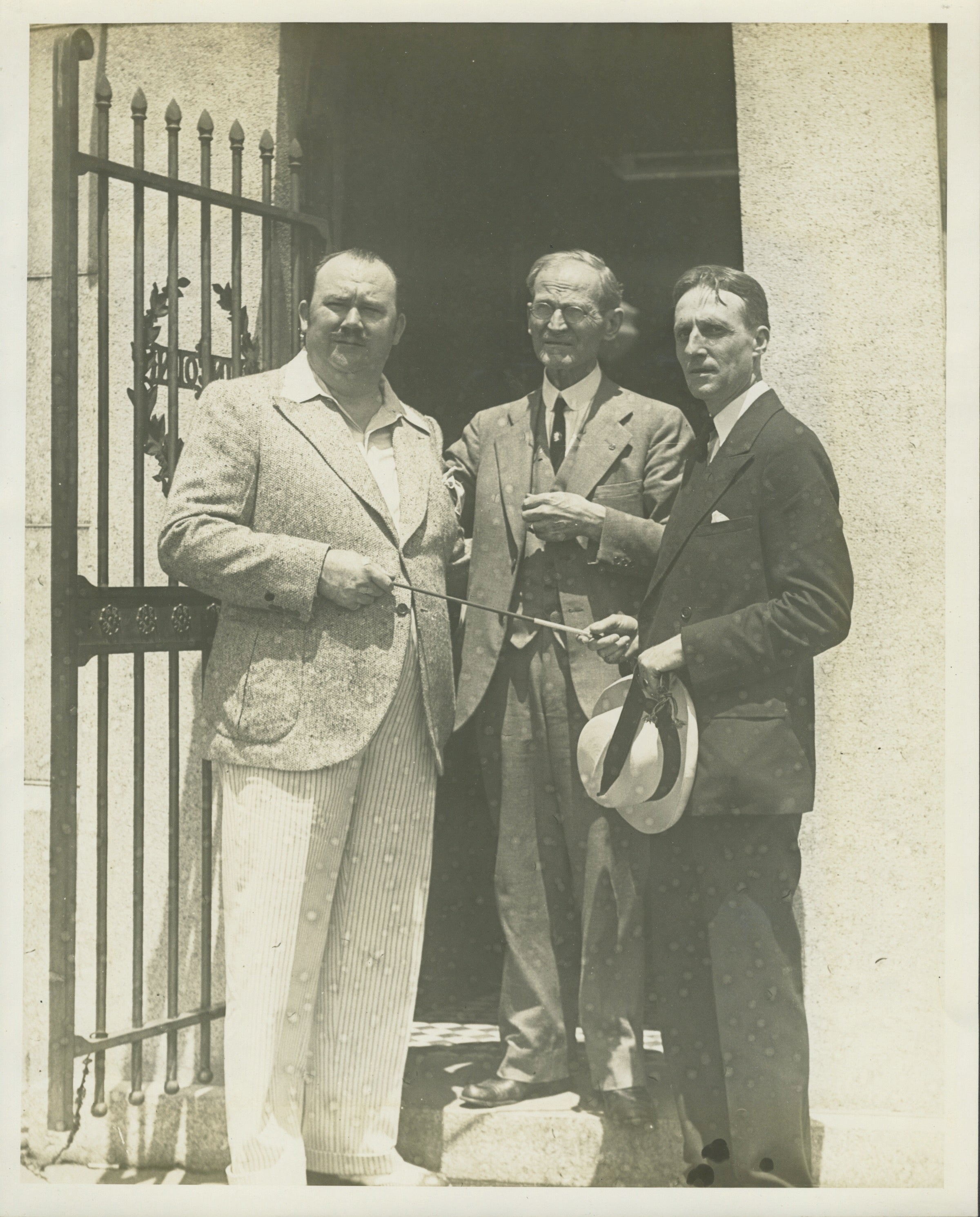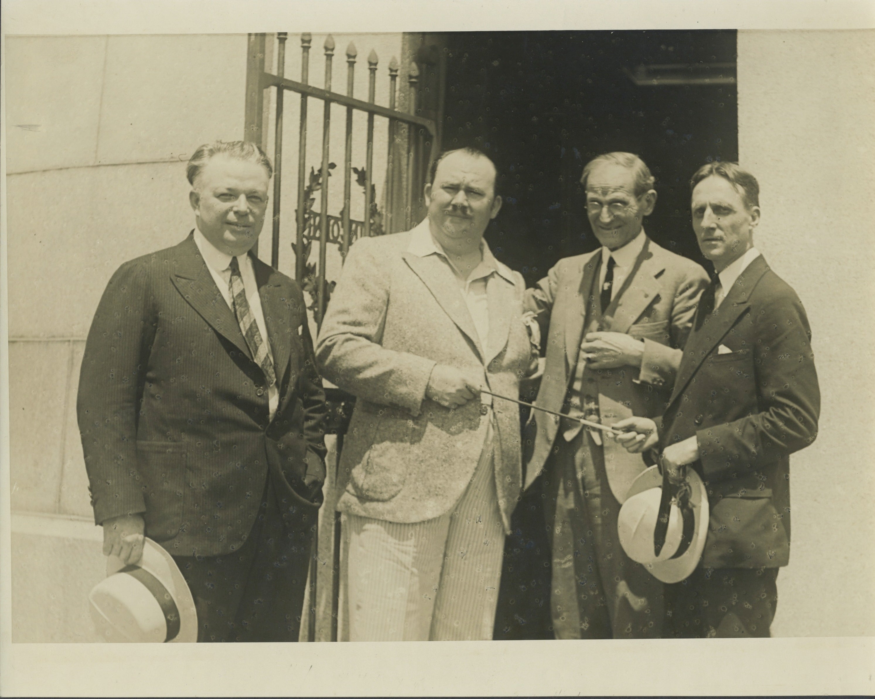 Whiteman, Paul. (1890–1967). Signed Photograph with Original Press Photographs. Signed photograph of the influential orchestral leader and self-dubbed "King of Jazz," together with two original 1929 press photographs. Whiteman is shown in a vignette portrait photograph and has signed and inscribed at the lower left, with the date of October 24, 1925 added in another hand. The two original press photographs show him in Springfield, Illinois, being presented by the mayor with a baton made out wood from Abraham Lincoln's home. A press clipping is included, dating the photograph to May 30, 1929: "Above you see in the picture John L. Taylor, local musician, Paul Whiteman, Jazz King, H. L. Fay, custodian of Lincoln's tomb and Mayor J. Emil Smith, presenting Whiteman with a baton made out of wood taken from Lincoln home." In very fine condition. Photographs each 8 x 10 inches (20.3 x 25 cm).