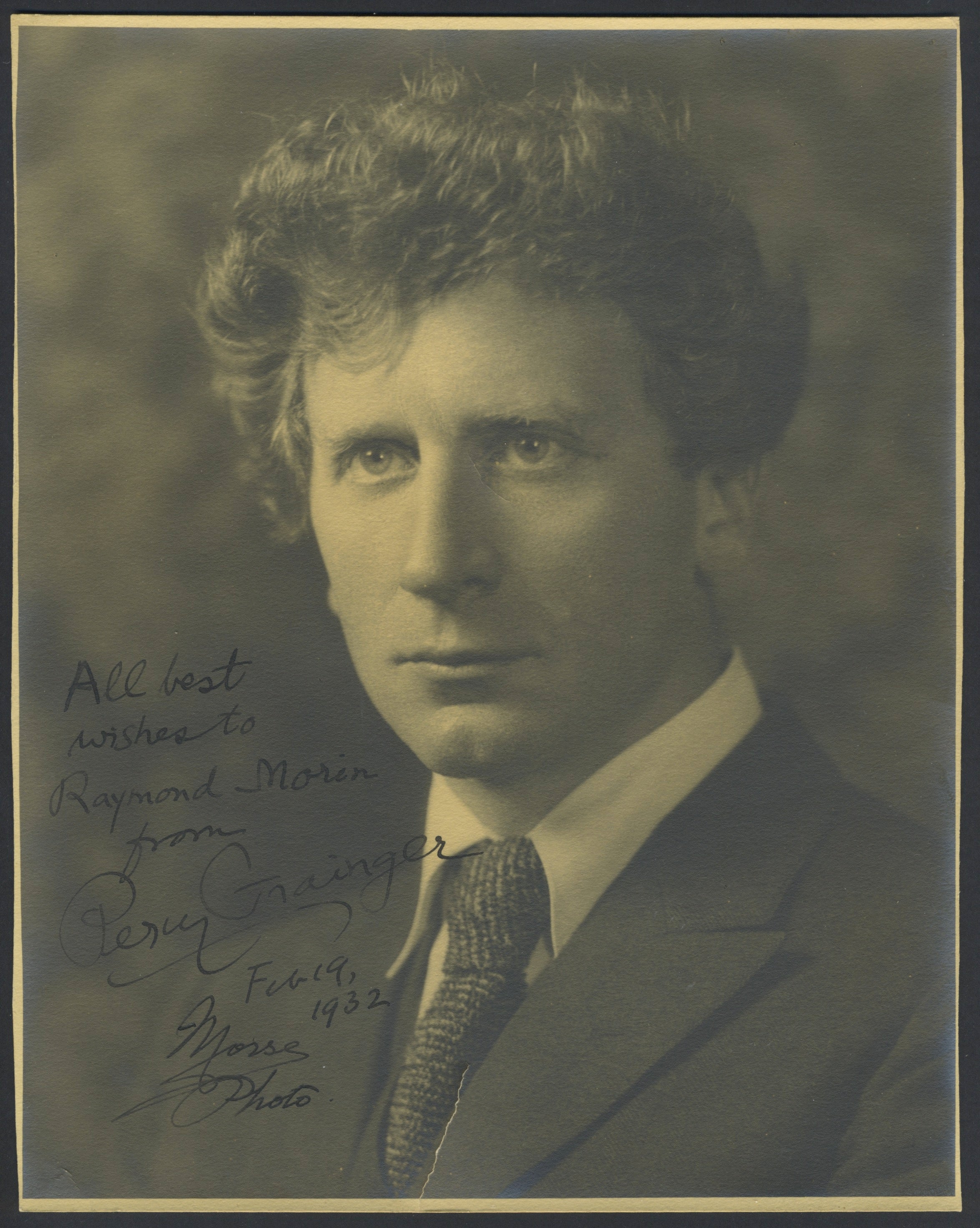 Signed photograph of the Australian-born pianist, conductor, and composer best known for his folk settings and colorfully experimental works. Matte sepia print, signed and inscribed at the left and dated February 19, 1932. Photographed by Morse Photo. Toning; one vertical tear at the lower margin; otherwise fine. 7.5 x 9.5 inches (19.3 x 24.3 cm).