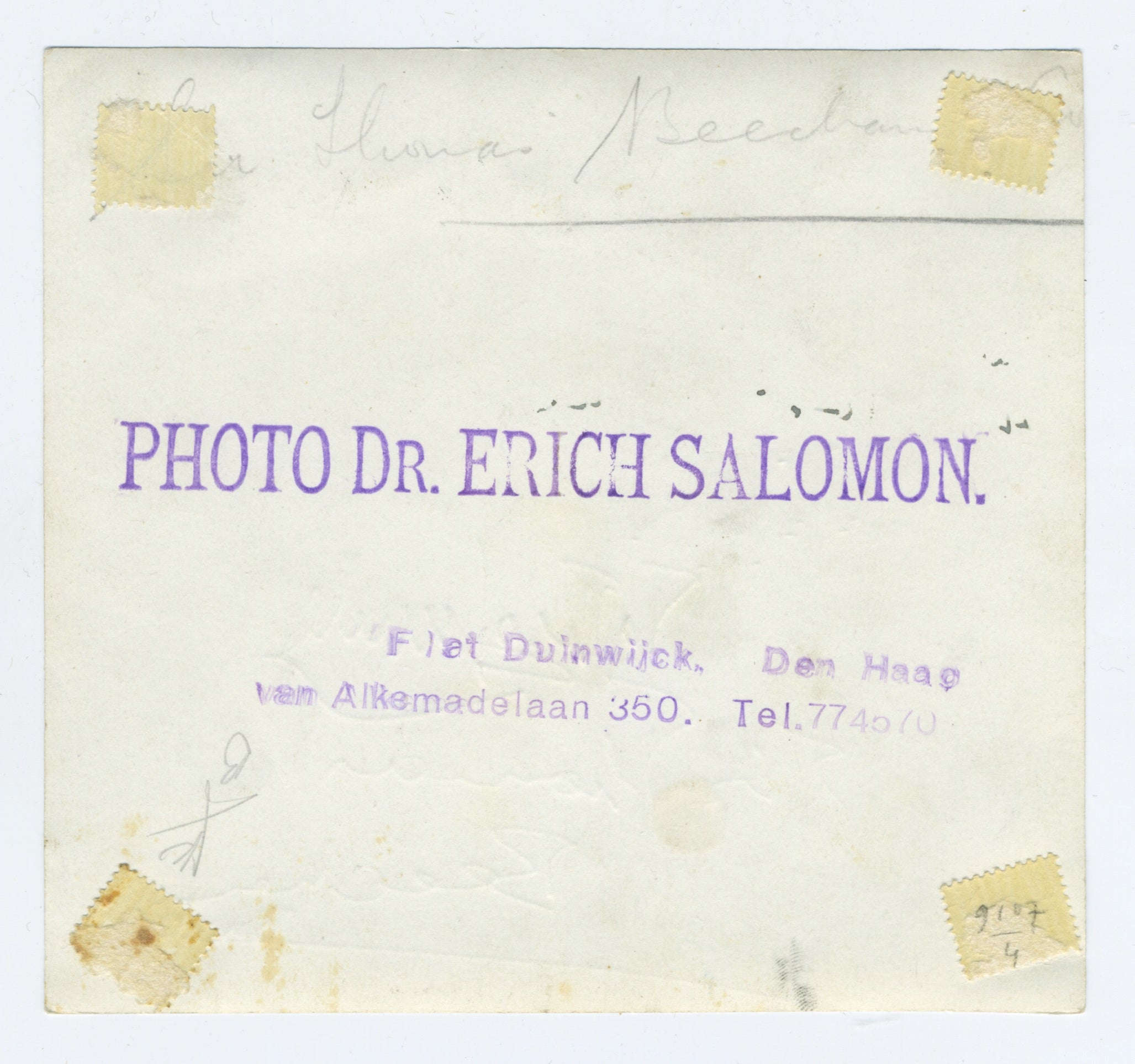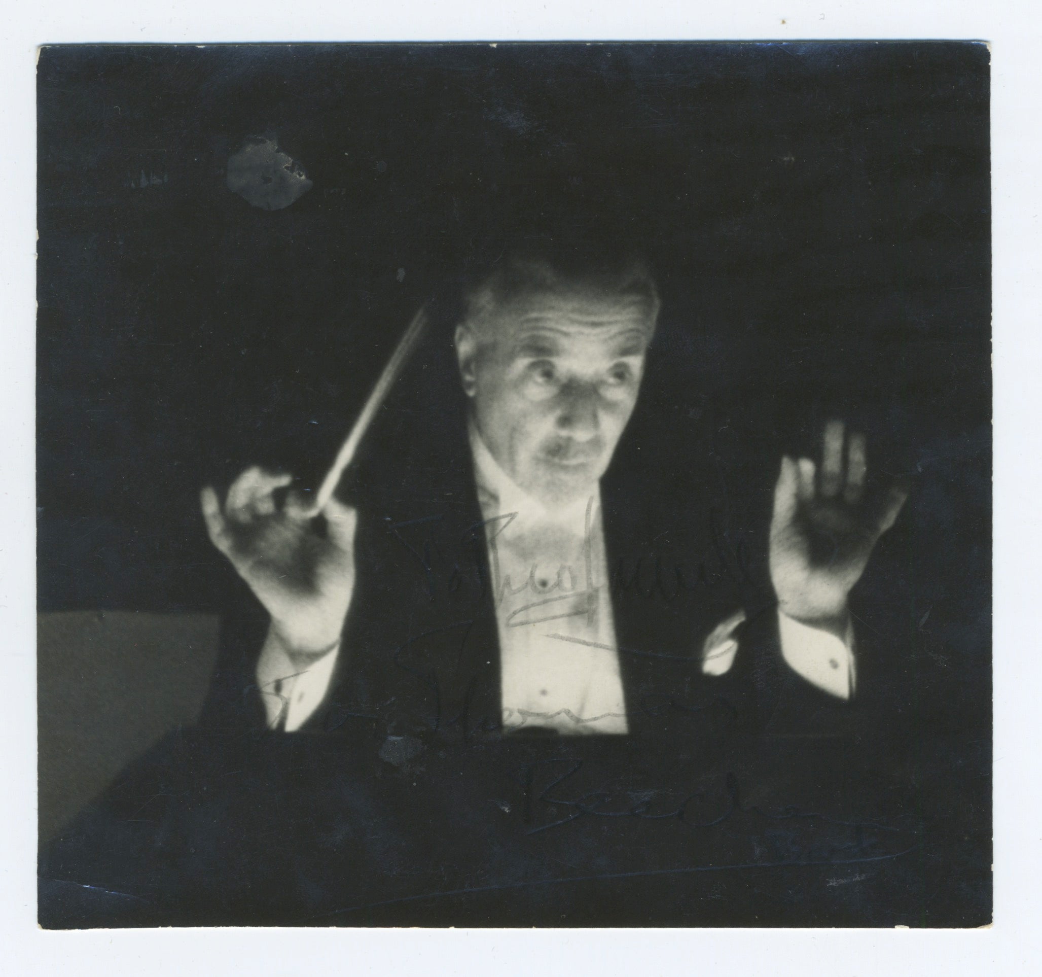 Atmospheric original Erich Salomon of Den Haag gelatin silver print of the British conductor leading an ensemble in performance. Beecham has inscribed "To Theo Laude [?] / Sir Thomas Beecham / Bart" to front. Photographer's stamp to verso. Signature low-contrast, some spotting to image, overall in fine condition. 5.25 x 5 inches (13.3 x 12.3 cm.).