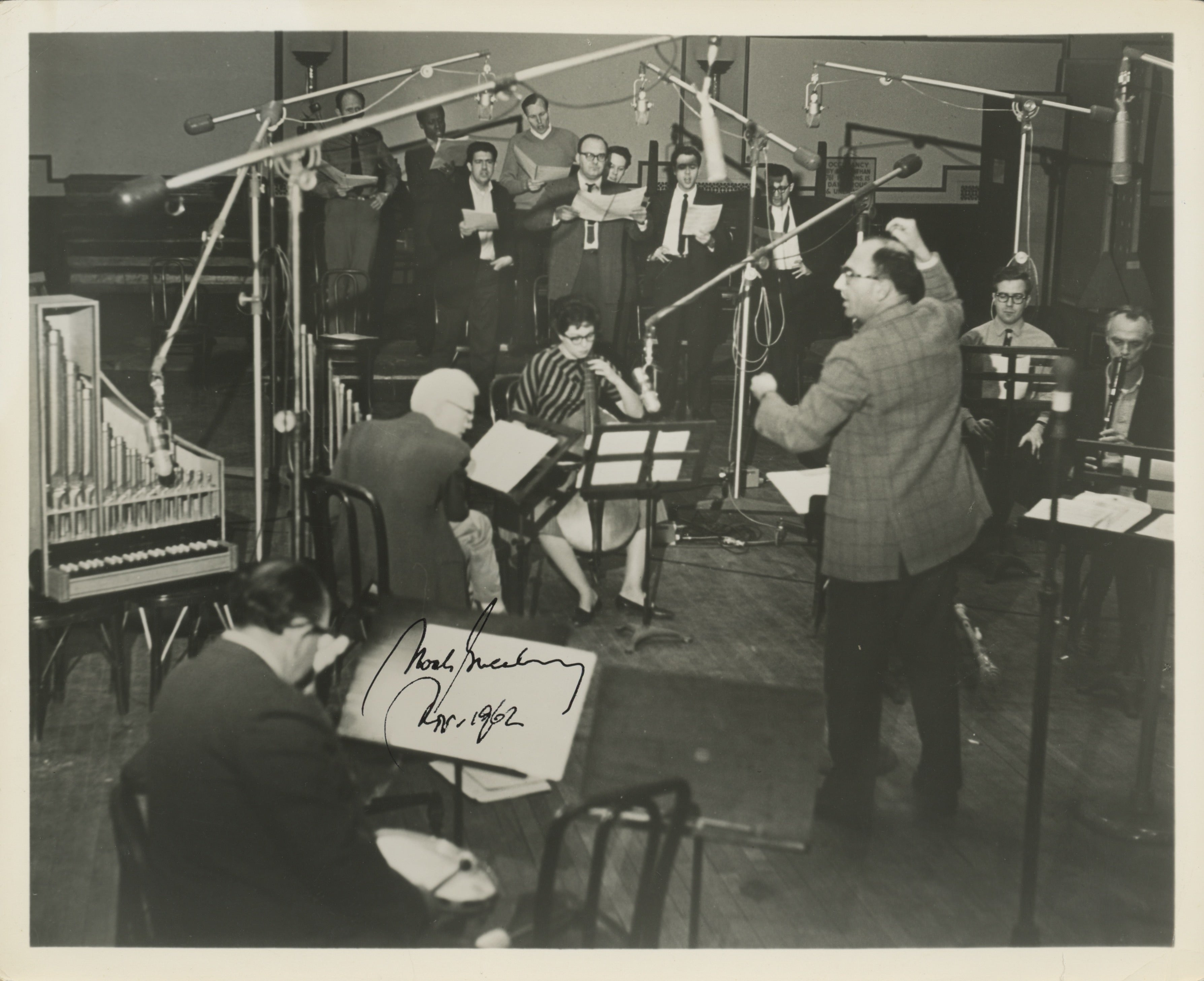 Original photograph of the New York Pro Musica co-founder leading the ensemble, which specialized in Medieval and Renaissance music, in a performance at an unidentified recording studio. Greenberg has signed "Noah Greenberg / Nov. 1962" in black ink. New York Pro Musica stamp to verso. Light surface creasing to upper left and lower right corners, image unaffected, overall in fine condition. 10 x 8 inches (25.4 x 20.3 cm.).