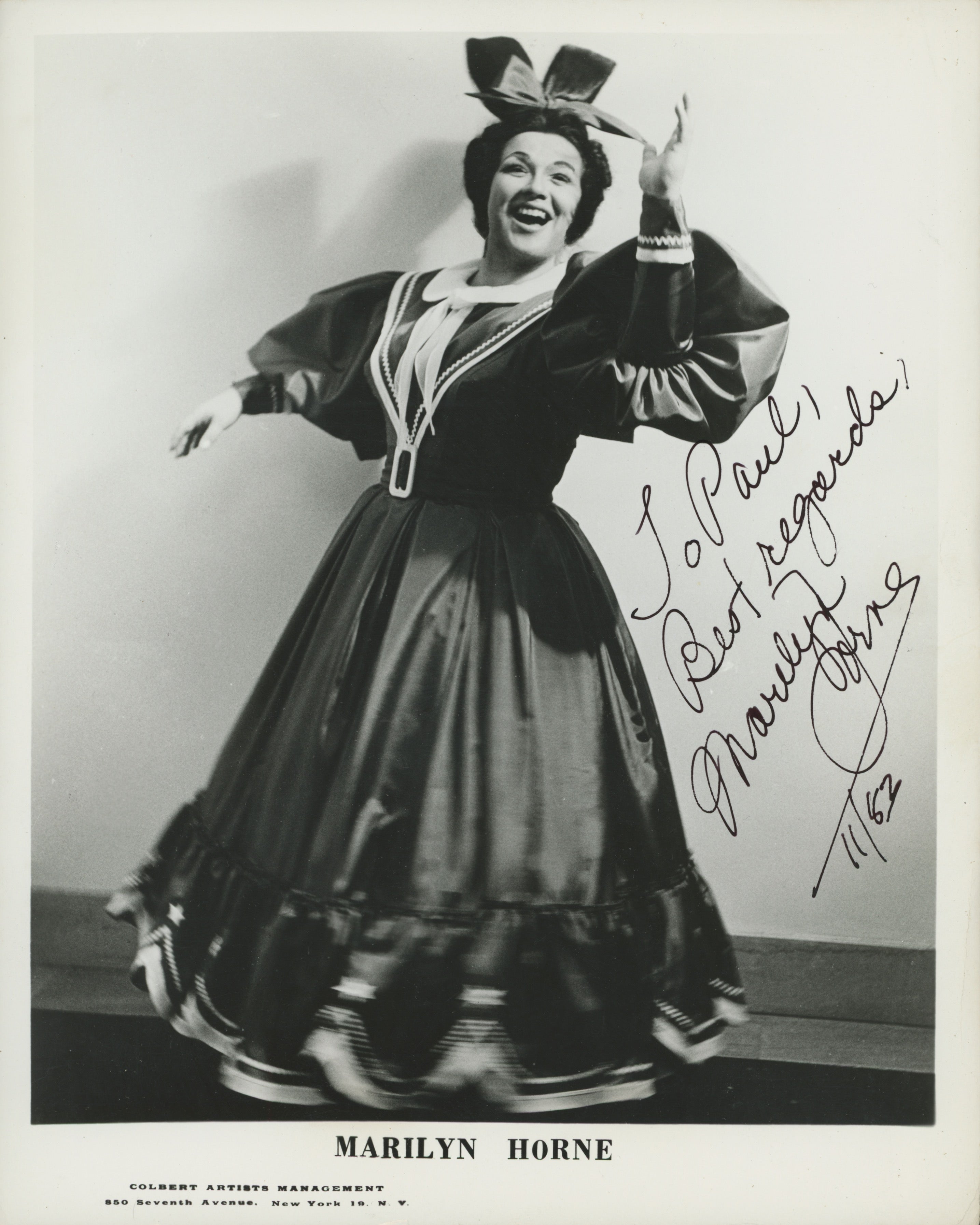 Joyous signed photograph of the American mezzo-soprano, who has inscribed "To Paul, / Best regards, / Marilyn Horne / 11/82," in costume as Isabella for a production of Rossini's Italiana in Algeri. Typewritten label mounted to verso. In fine condition. 8 x 10 inches (20.3 x 25.4 cm.).
