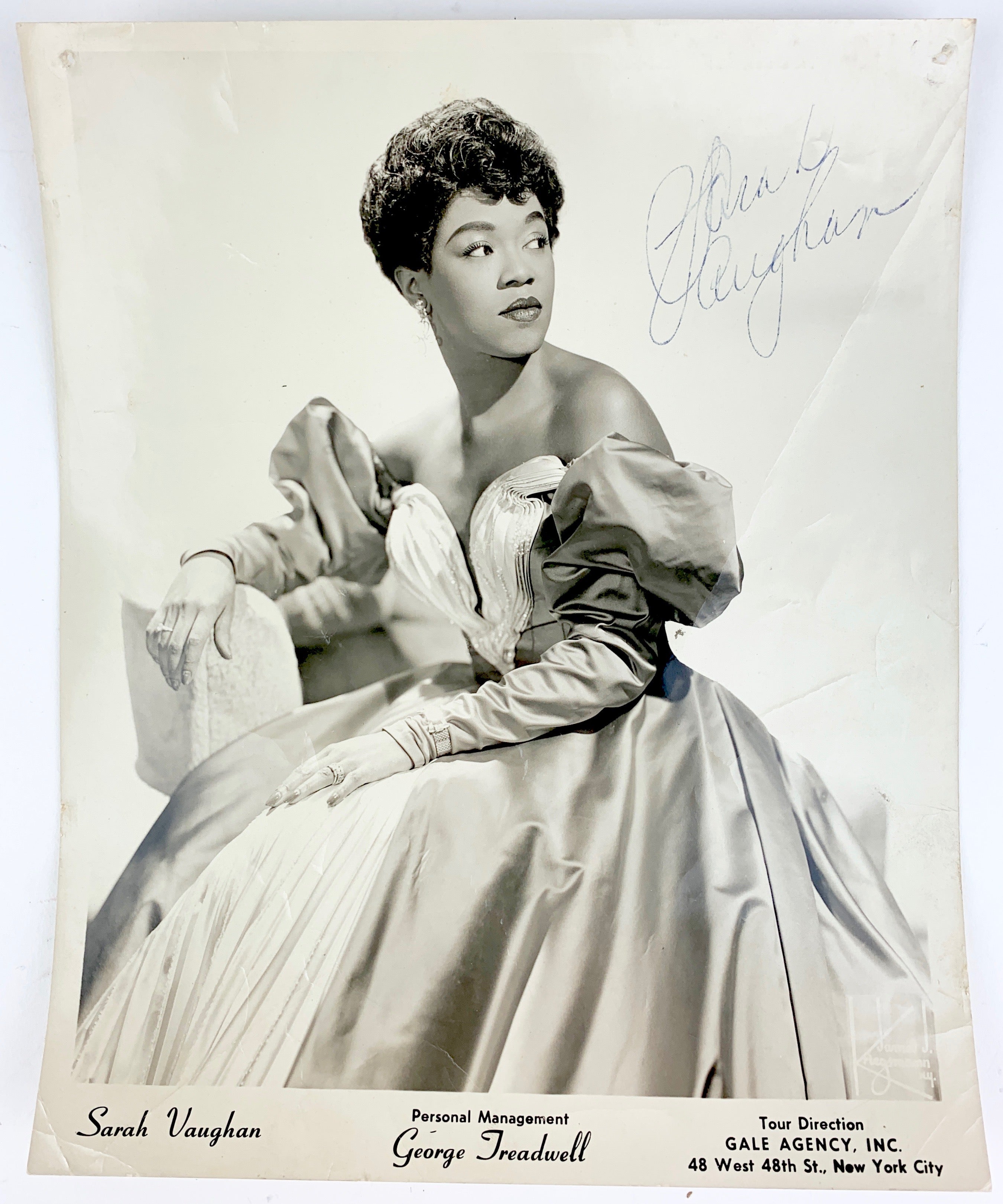 Early signed 1950s James J. Kriegsmann photograph of the great American jazz vocalist, shown wearing an opulent ball gown. Pinholes to upper corners, significant diagonal crease and smaller areas of surface creasing, otherwise in very good condition. 8 x 10 inches (20.3 x 25.4 cm).