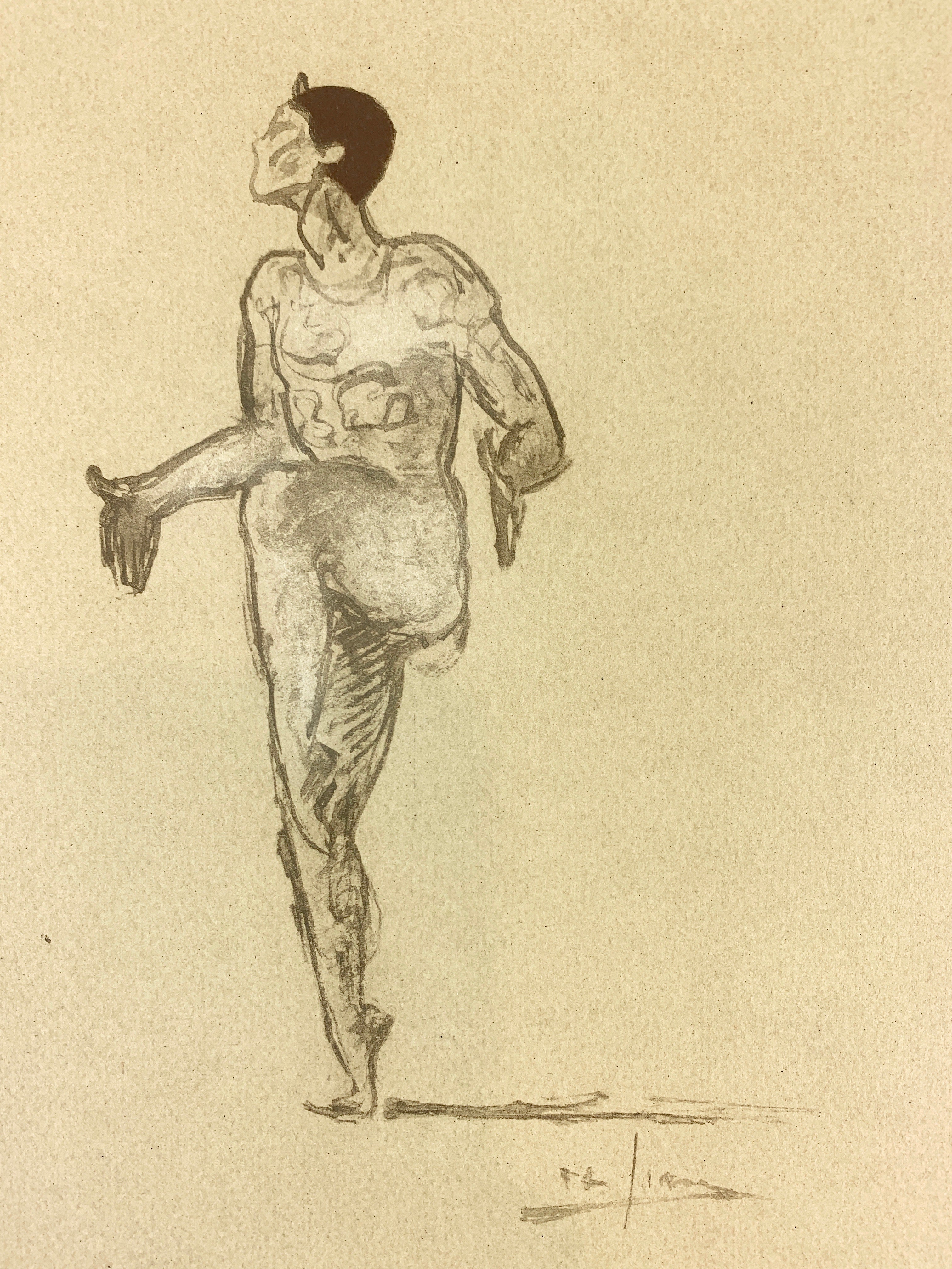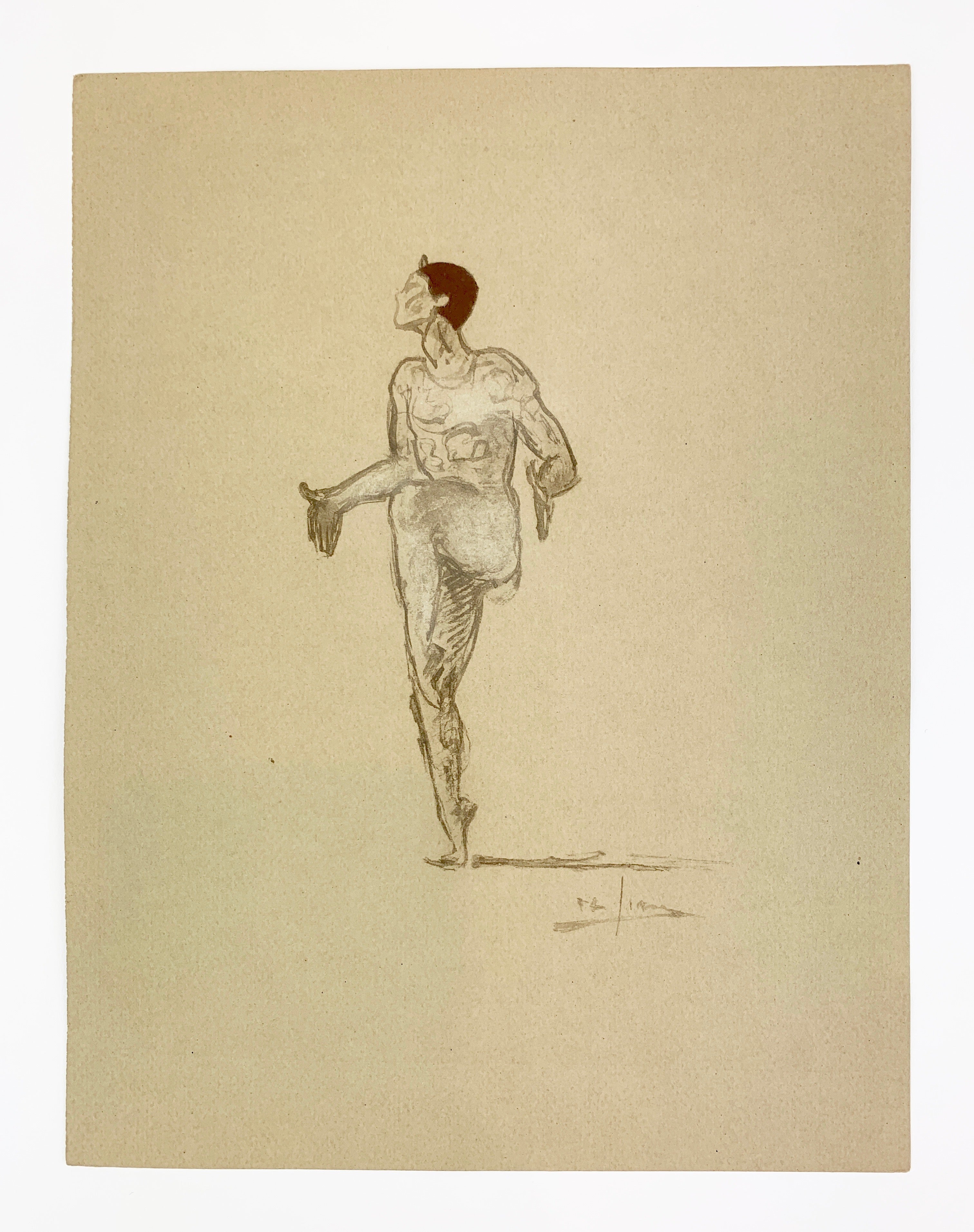 [Nijinsky, Waslaw. (1889-1950)] Algi, Edmond van Saanen. (1882-1938). "L'après-midi d'un faune" - Original Drawing. An exceptional original ink and wash drawing of Waslav Nijinsky in probably the most famous of all his roles, as the titular Faun in his 1912 ballet for the Ballets Russes. Signed by the artist to the lower right. 9.5 x 12.5 inches.