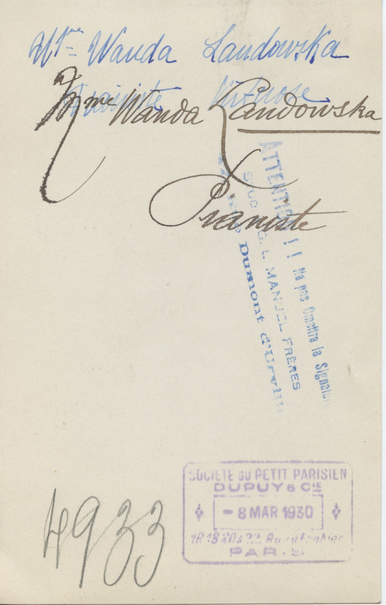 Unusual slightly soft-lense original Manuel Freres photograph of the Polish-French harpsichordist. Handstamps of Société du Petit Parisien, dated March 8, 1930, and Studio Manuel Freres, Paris, to verso. 7 x 4.5 inches (18 x 11.5 cm). In fine condition.