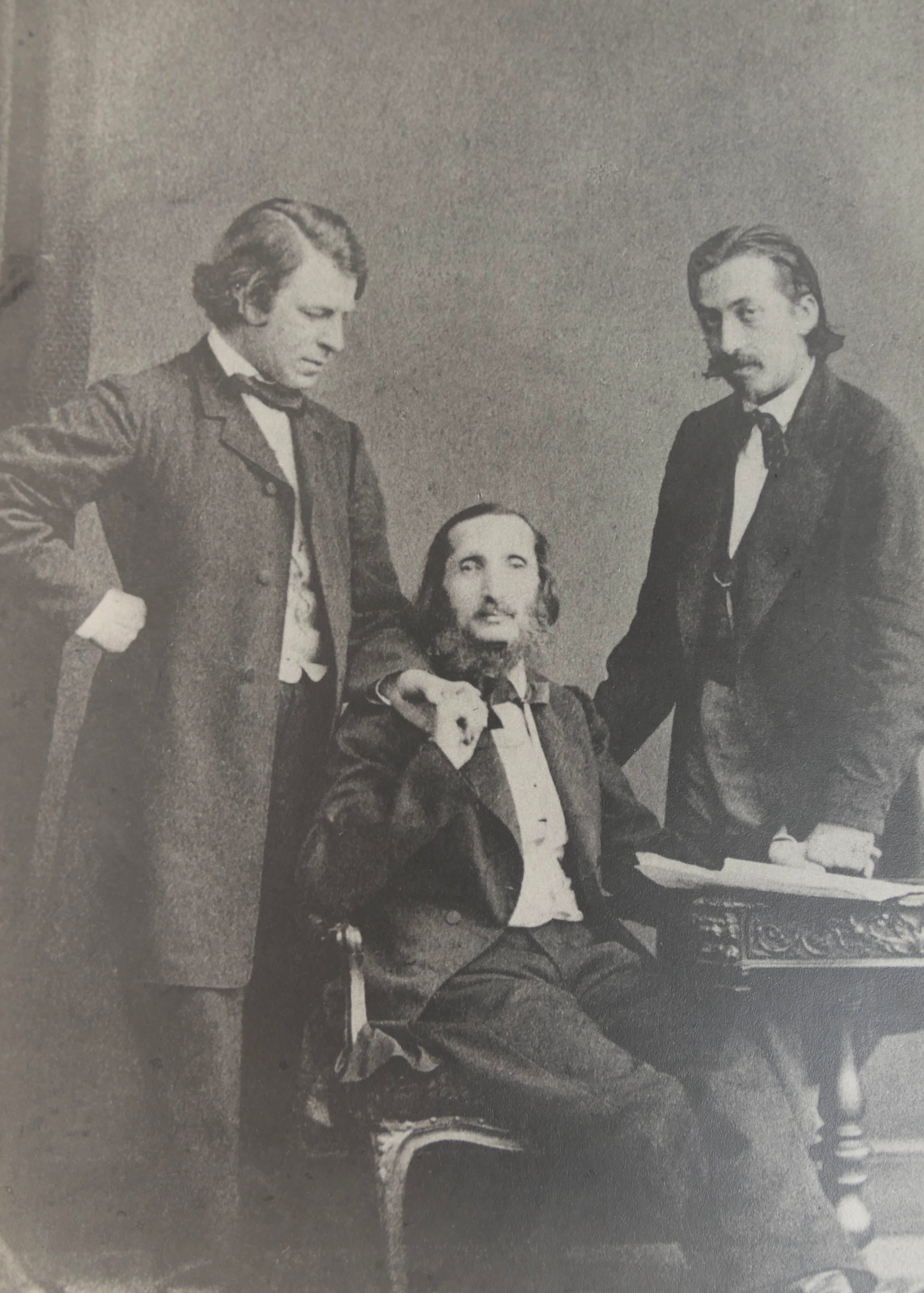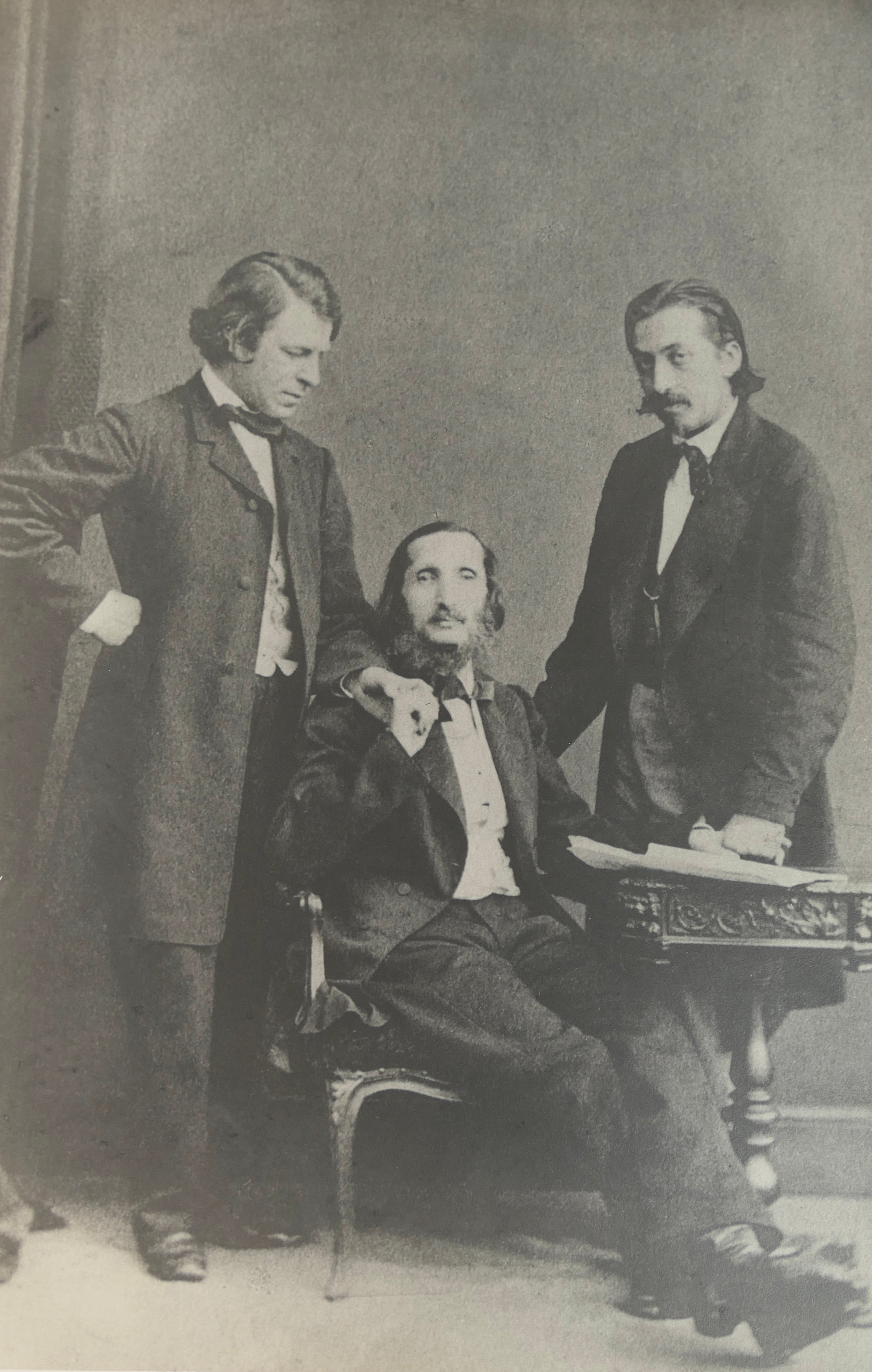 Large reprint photograph, probably ca. 1960s, of the three great violin virtuosi together, around the time of their appearances together in London as part of the Beethoven Quartet Society, ca. 1859. This was a musical society established in 1845 in London dedicated to the String Quartets of Beethoven, and where in the 1850s, these three giants performed with cellist Alfredo Piatti - Joachim and Ernst playing the violin, Wieniawski the viola. Photograph printed on heavy photo paper. 7.75 x 12.2 inches; 19.6 x 30.6 cm. Fine. Though unsigned or marked, this photograph originally belonged to the violinist Ruggiero Ricci and was found in an unrelated musical score from his library.