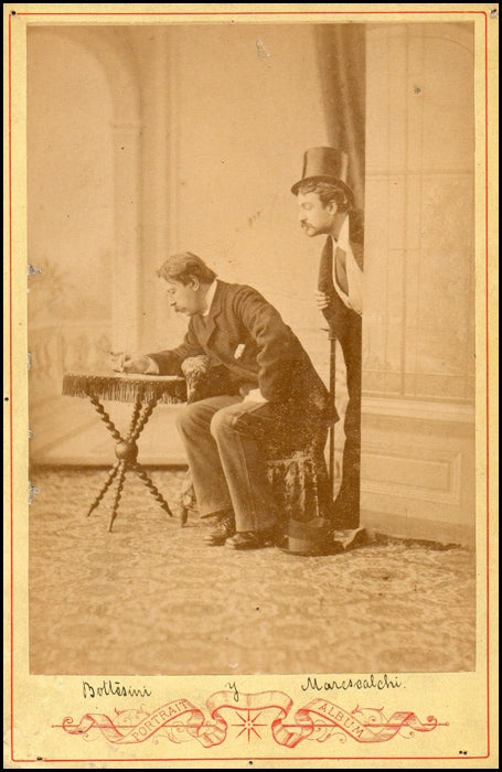 Bottesini, Giovanni. (1821 - 1889). Rare Cabinet Photograph with Marescalchi. A remarkable original photograph by Luis Pozzi of Buenos Aires, showing the Italian double bass player/composer/conductor in an unusual scene with the great Italian baritone, Arturo Marescalchi (1855 - 1911). A few small pinholes to margins, overall very fine condition. 10.5 X 16.5 cm.