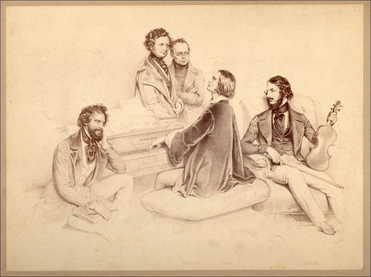 Large albumen photograph of the famous 1846 drawing of Liszt surrounded at the piano by (from left to right) : Josef Kriehuber (who did the drawing), Berlioz, Czerny and Ernst. Issued by Ditson of Boston, ca. 1880. 7 x 9.25 inches and in very fine condition.