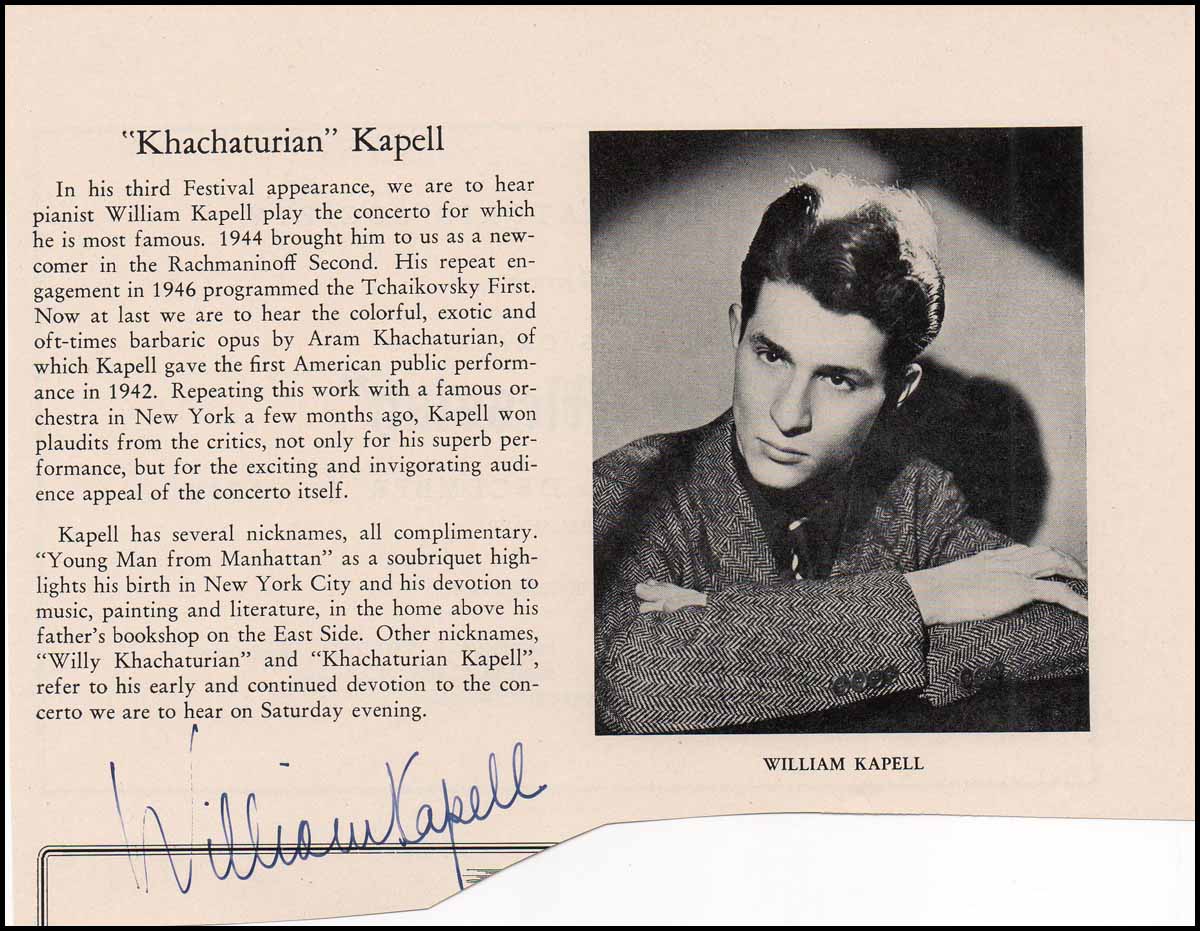 Rare signed photograph of the great pianist whose flourishing career was cut tragically short by a plane crash on the way back from Australia. Copland wrote of him: “ I cannot conceive of his ever having given a dull performance – an erratic one, perhaps, a misguided or stylistically incongruous one maybe, but invariably one that was electric and alive.” Boldly signed below his photograph on a bio clipped from a program where he was billed as "'Khachaturian' Kapell." 8.5 x 5.5 inches.