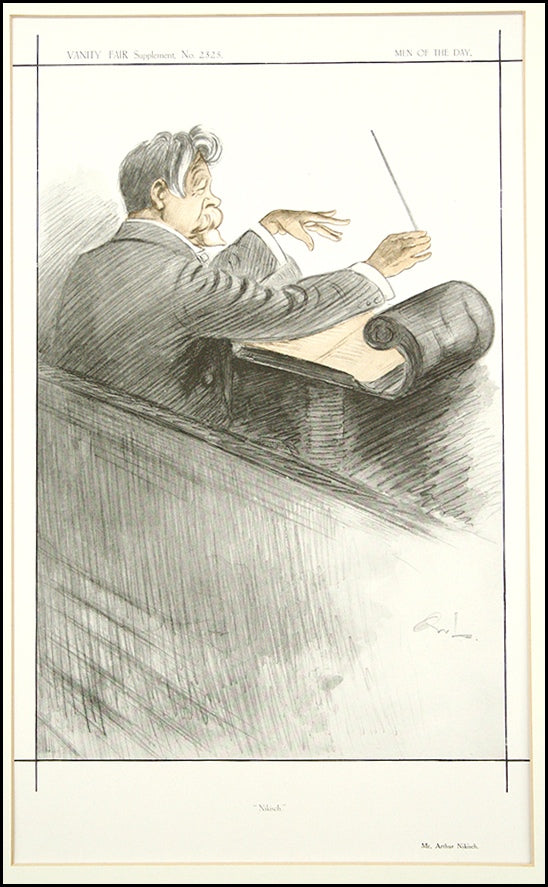 Nikisch, Arthur. (1855-1922). 1913 Vanity Fair Portrait. A spirited portrait of the great conductor in a fine chromo-lithograph caricature published in the English weekly magazine Vanity Fair on May 28, 1913. Nikisch is shown in his conductor's booth in action. The portrait is by the artist known as "Owl," one of the most famous of the outstanding caricaturists who published in the magazine. In excellent condition, 15 x 10.5 inches.
