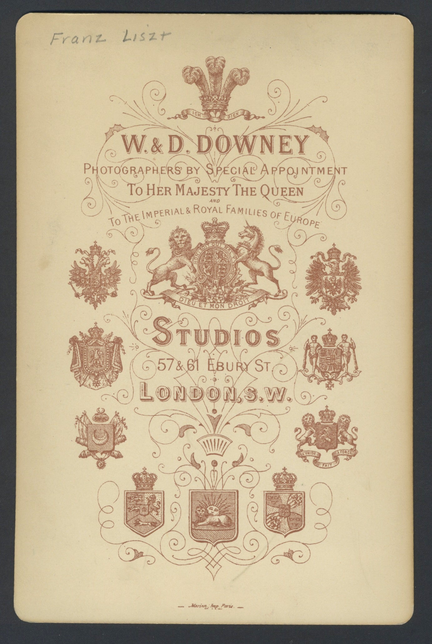Liszt, Franz. (1811–1886). Original Cabinet Photograph. A fine original W & D. Downey of London cabinet photograph of the elderly composer and pianist, seated next to a piano with his student Leonhard Emil Bach (1849 - 1902) standing beside him. In very fine condition.