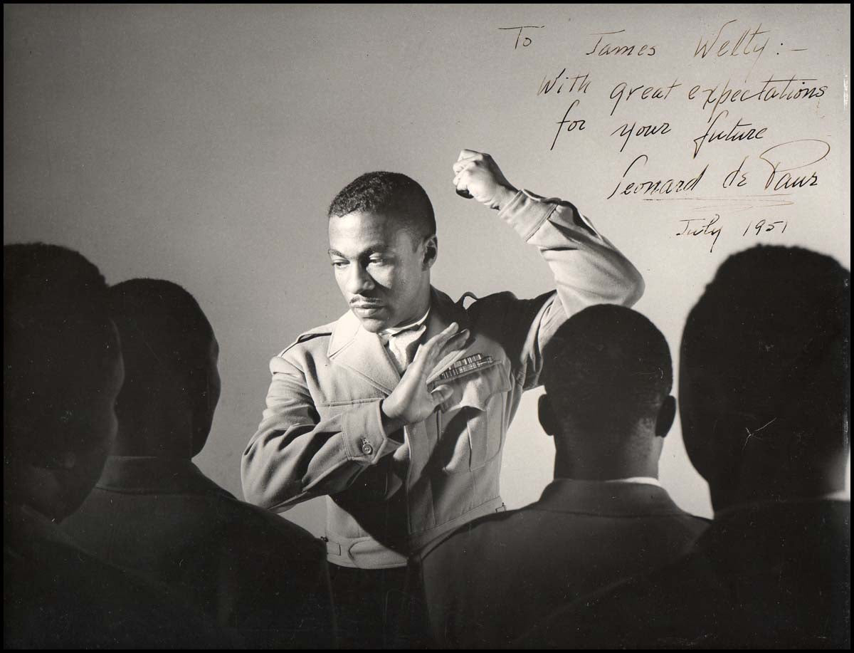 Paur, Leonard de. (1914 - 1998). Signed Photograph. A very fine original 7 x 9 inch black and white photograph, boldly signed and inscribed in 1951 by the African American composer and choral director. Scarce.