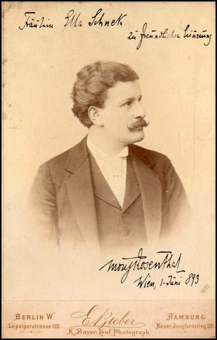 Rosenthal, Moriz. (1862–1946). Signed Cabinet Photograph. Scarce original cabinet photograph by E. Bieber of the great pianist, signed and inscribed in 1893. Very fine. 16.5 x 10.8 cm.