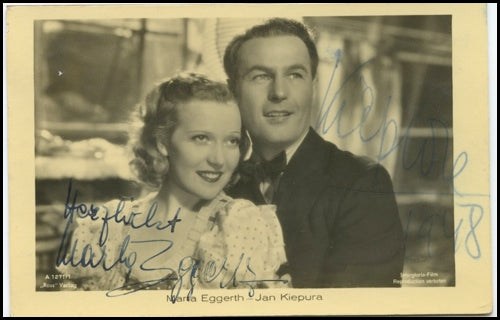Lovely signed postcard photograph of the marvelous operetta stars and famous husband and wife singing team, as they appeared in the 1936 film "The Charm of La Boheme." Eggerth is still singing in her late-nineties!