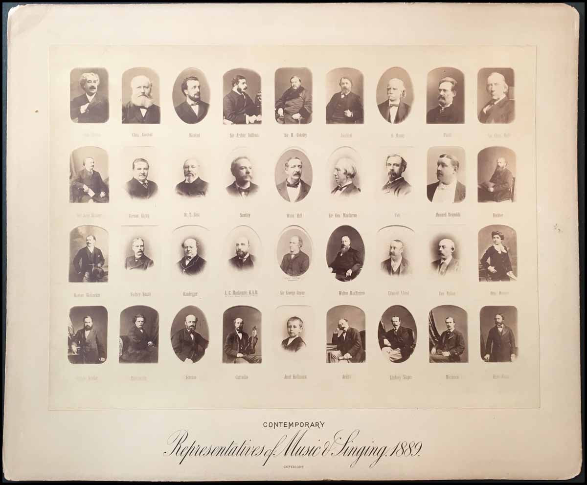 Highly unusual pair of 11 x 14 jumbo cabinet photos with 76 vignetted photos of great musicians and singers including: Anton Rubinstein, Joseph Hoffmann, Strauss, Von Bulow, Grove, Santley, Foli, Richter, Halle, Piatti, Joachim, Arthur Sullivan, Gounod, Lucca, Gerster, Trebelli, Hauk, Valleria, Albani, Patti, Roze, Sembrich, Clara Schumann, Nilsson, Nordica , etc, etc. Slight edge wear, but overall fine.