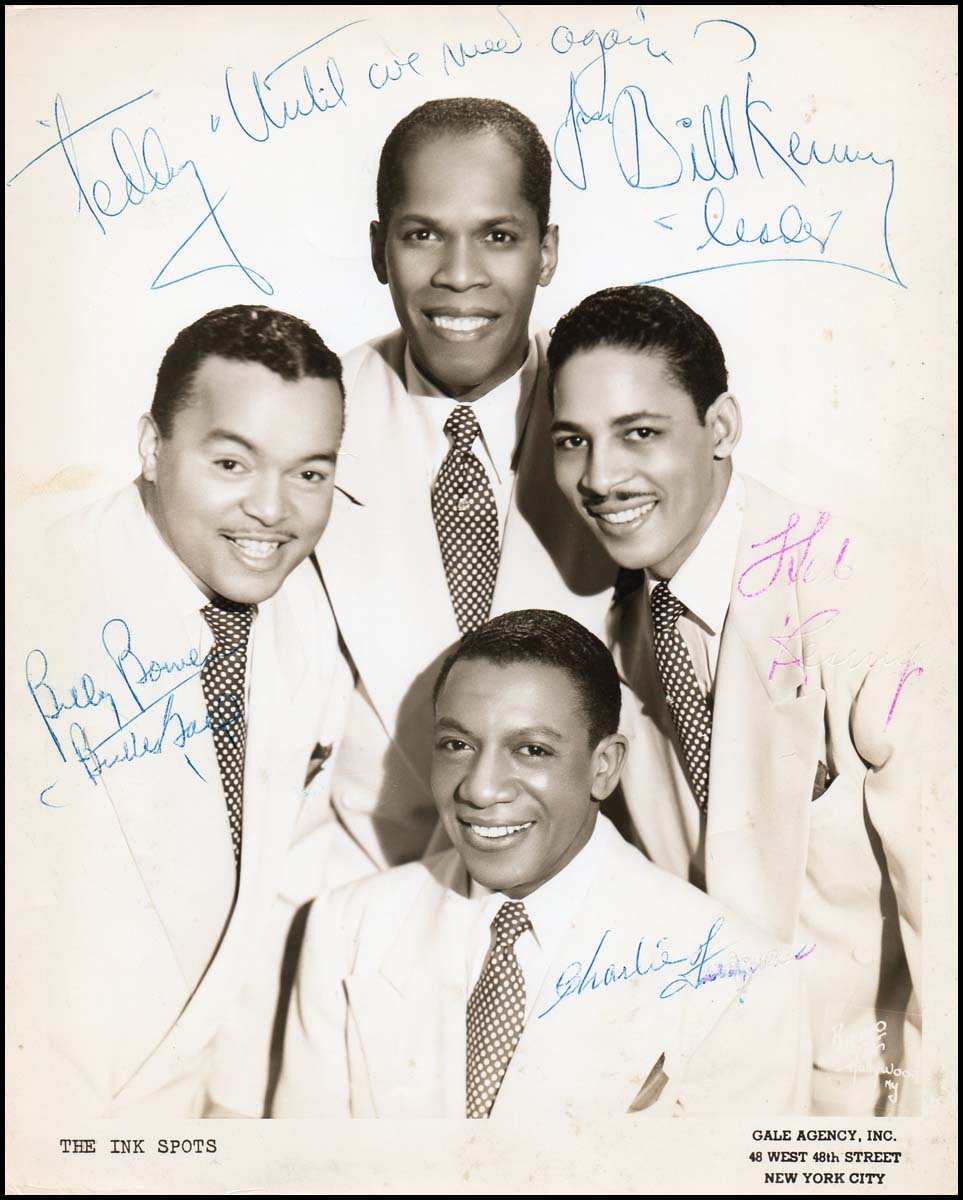 Ink Spots.. Signed Photograph. Vintage photograph of one of the most influential vocal groups of all time and the most imitated entertainers in show business. Signed and inscribed by Bill Kenny, Billy Bowen, Charlie Fuqua, and Herb Kenny. 8 x 10 inches. Corners creased, a few light spots, Herb Kenny's signature partially rubbed, else fine.