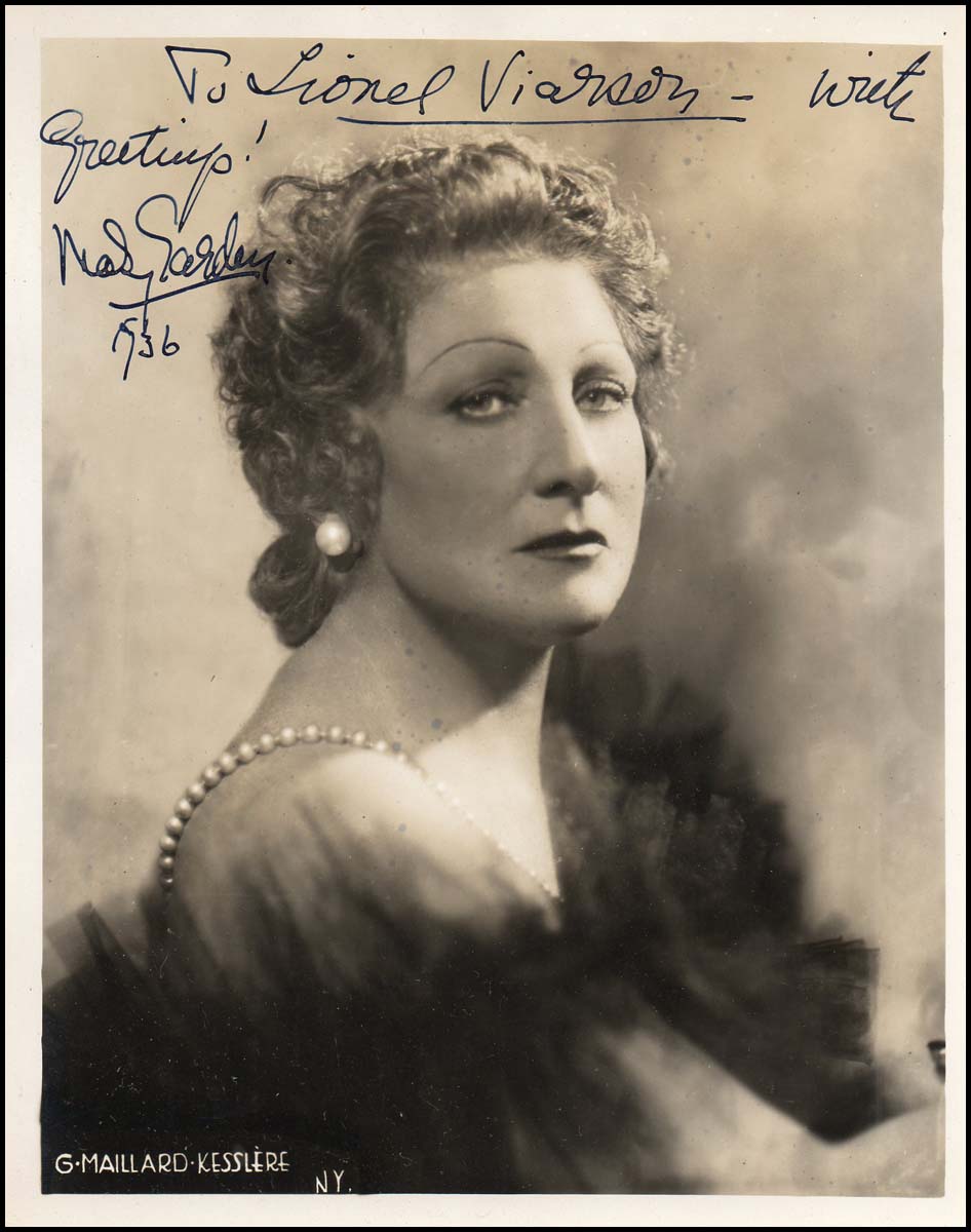 Moody original 8 x 10 inch doubleweight Maillard-Kesslere photograph of the legendary Golden Age soprano, signed, inscribed and dated 1936 in bold black fountain pen ink. Fine.